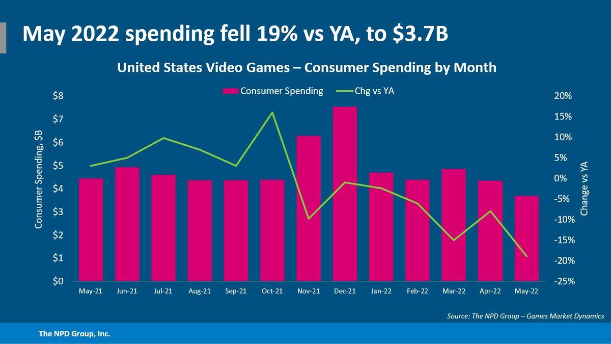 Аналитическая компания NPD Group выпустила отчет о положении на американском игровом рынке в мае 2022 года. По сравнению с прошлым годом выручка упала на 19%, до $3.7 миллиарда. Это худший результат с февраля 2020 года.