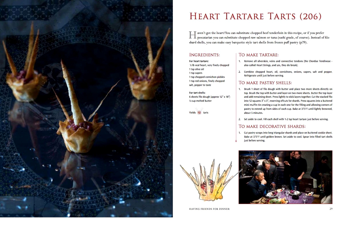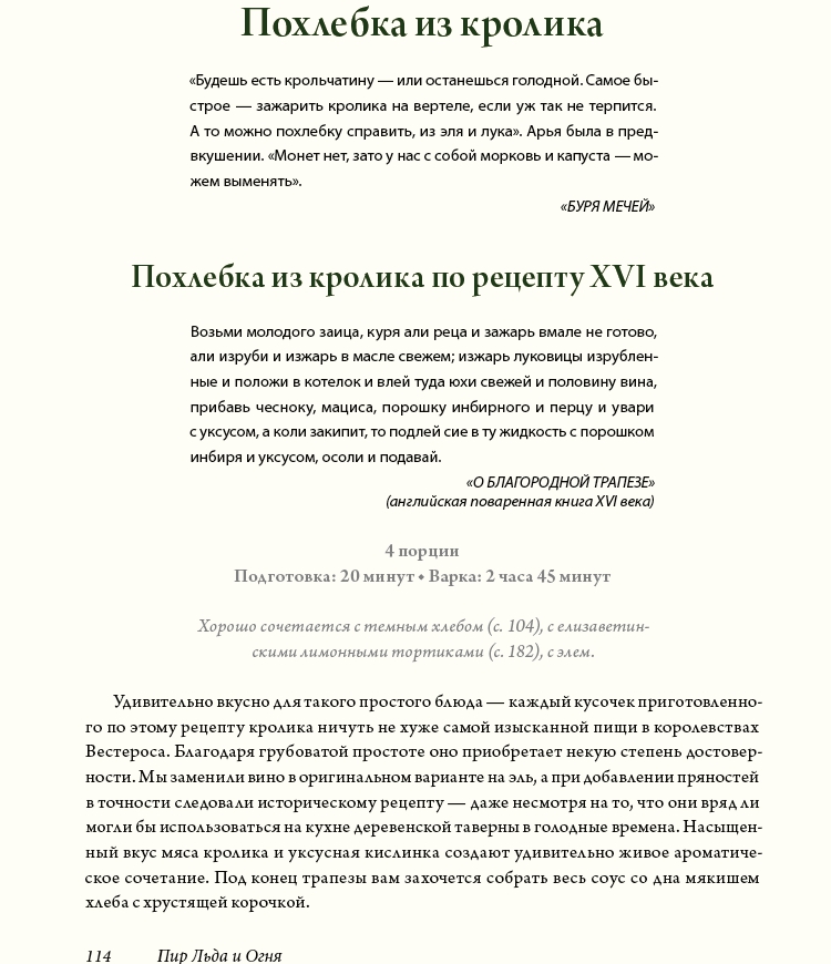 Помимо наличия аппетитных фотографий, авторы позаботились о том, чтобы под каждым рецептом была цитата из книги и выдержки из классических поваренных книг прошлых столетий. Кстати, можете спрятать верблюжье мясо, драконьи яйца и живых голубей. Рецепты адаптированы под современность и никакого кролика свежевать не придётся. А хотелось.