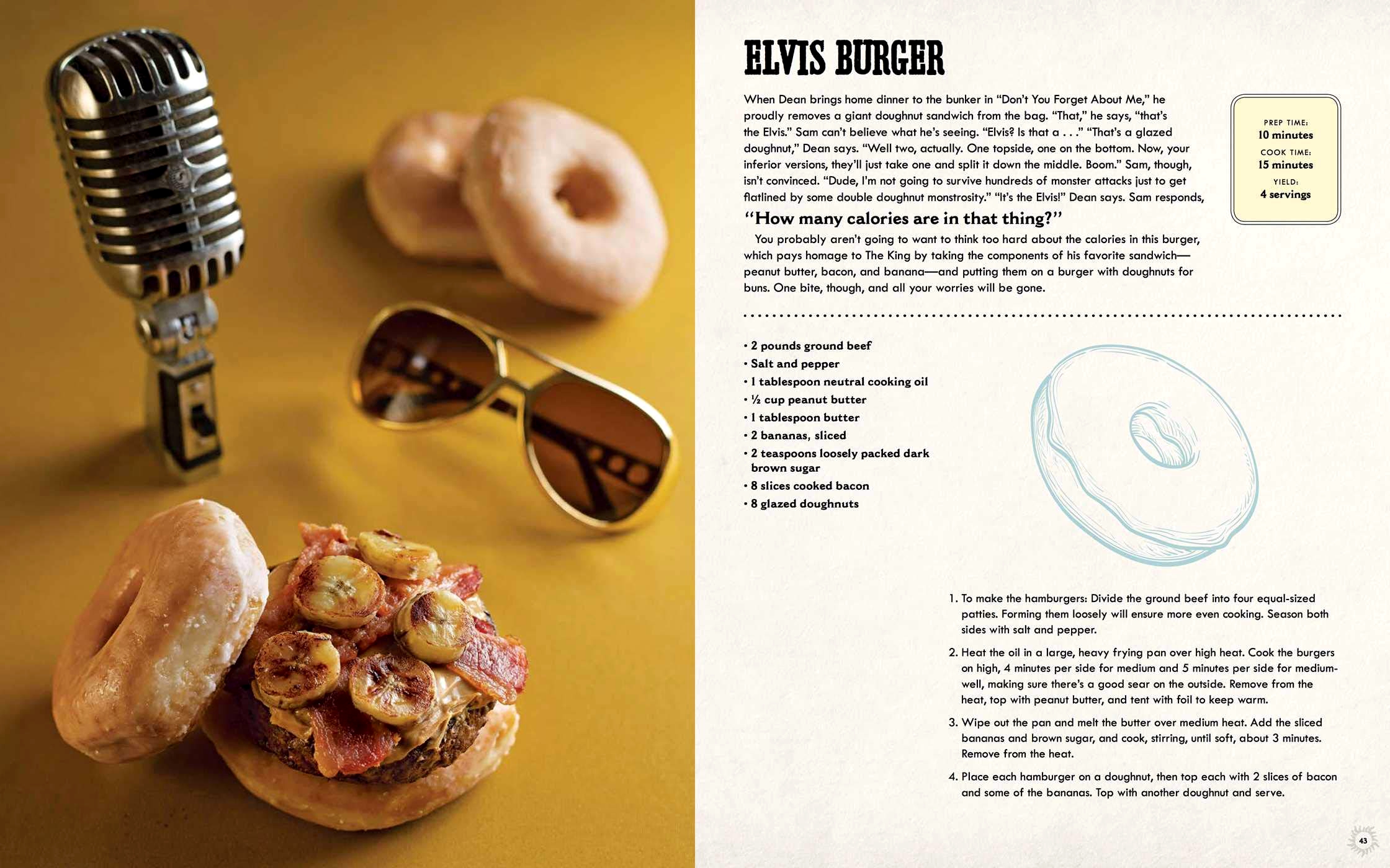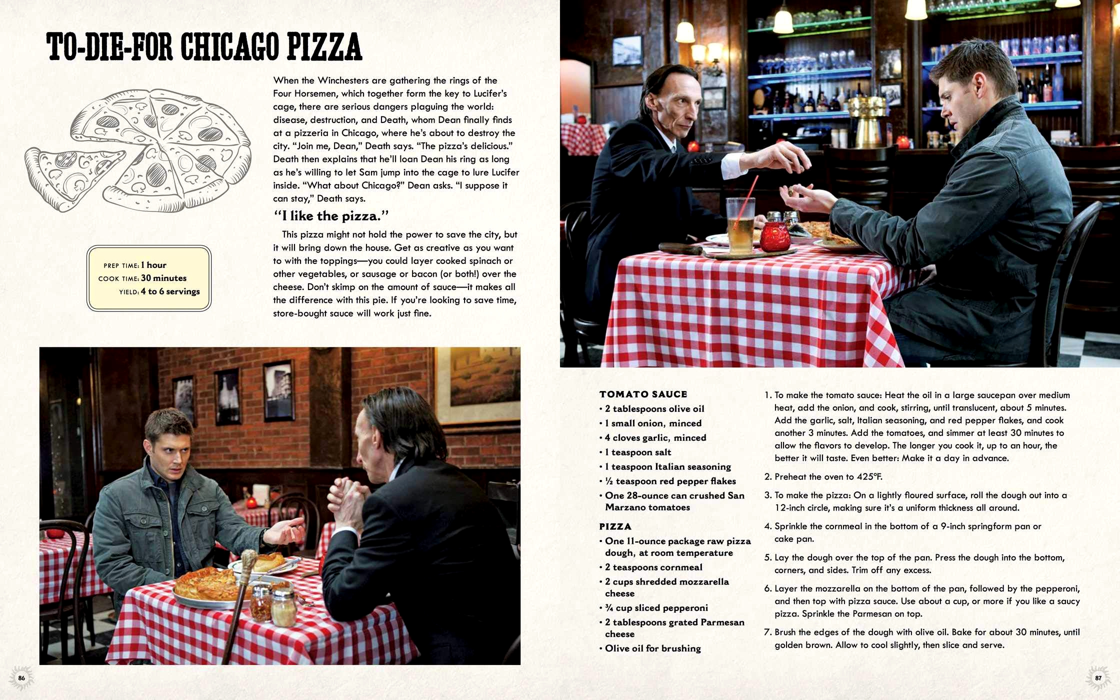 Так что никаких вам моллюсков или долгого копчения. Блюда простые и под стать стилю жизни Дина и Сэма, которые завтракают, обедают и ужинают в придорожных кафе. Для тех, кто следит за калориями, будет мало интересного: рецепты сплошь картошка, масло и тесто. Журнал Food and Wine вообще назвал эту книгу «данью нездоровой пище». Но это, на мой взгляд, только плюс.