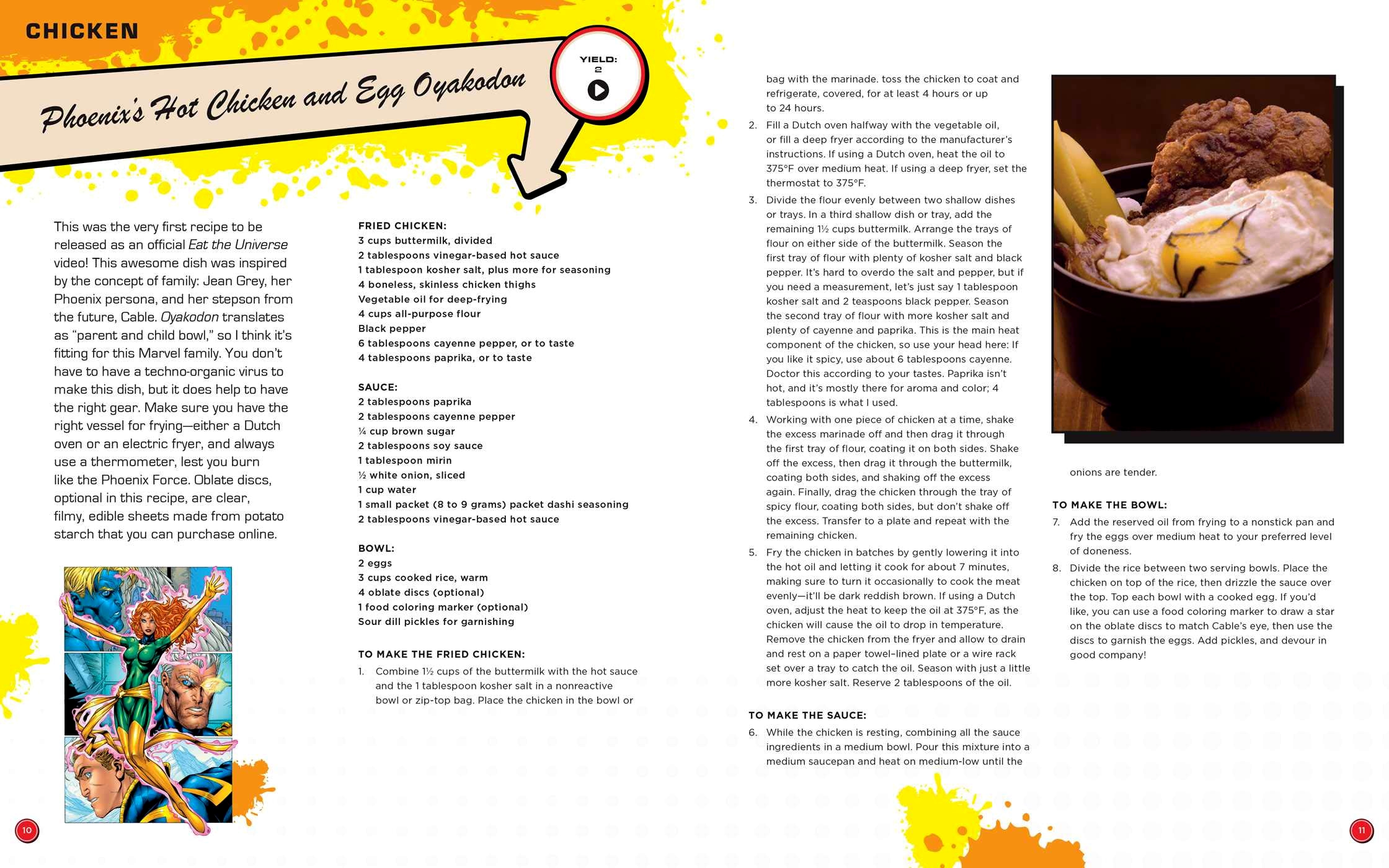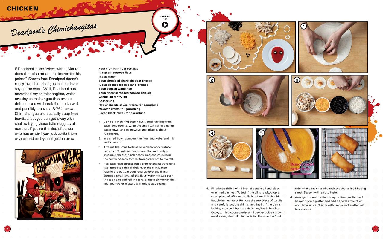 Из всех кулинарных книг в этой статье у Marvel получилось создать самую стильную и дотошную одновременно. Я, честно признаться, был в восторге, увидев разворот со знаменитыми чимичангами, где, помимо забавного вступления, нашлось место и для пошаговых инструкций в виде фотографий.