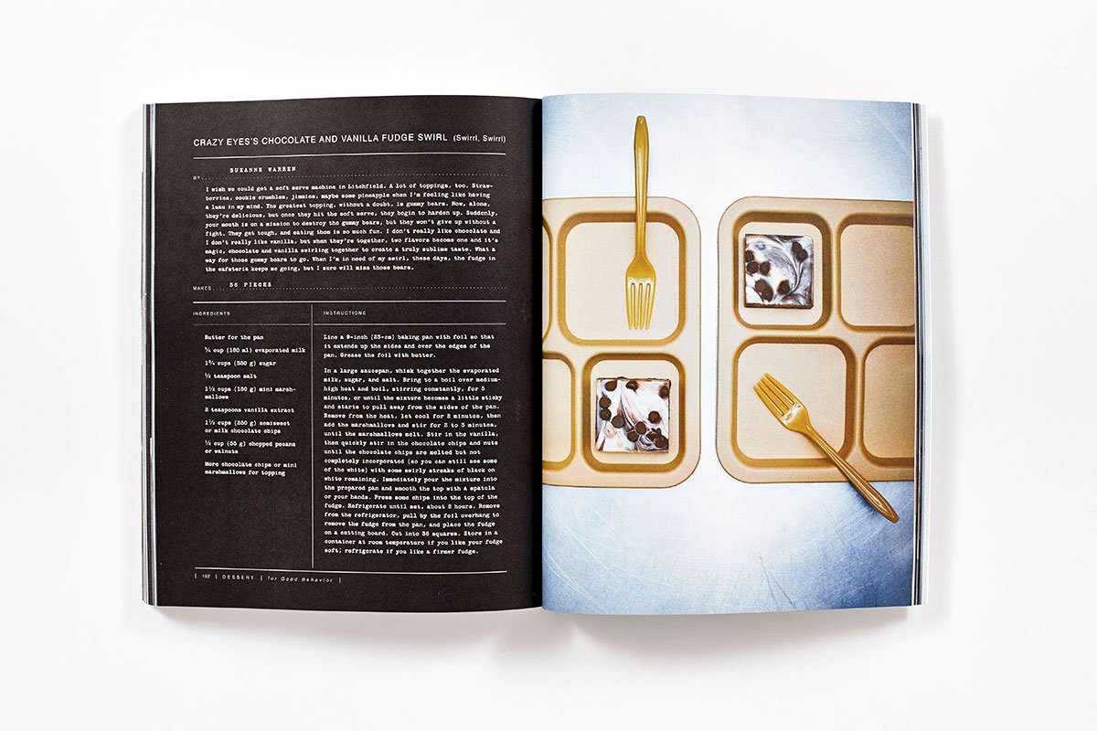 Меня порадовали разделы и оформление. Для своей «тюремной» книги, авторы распределили рецепты по приёмам пищи: завтрак, обед и ужин. А вот вместо эстетически прекрасных фотографий на фоне цветов и красивой посуды решили остановиться на подносах и пластиковых тарелках.