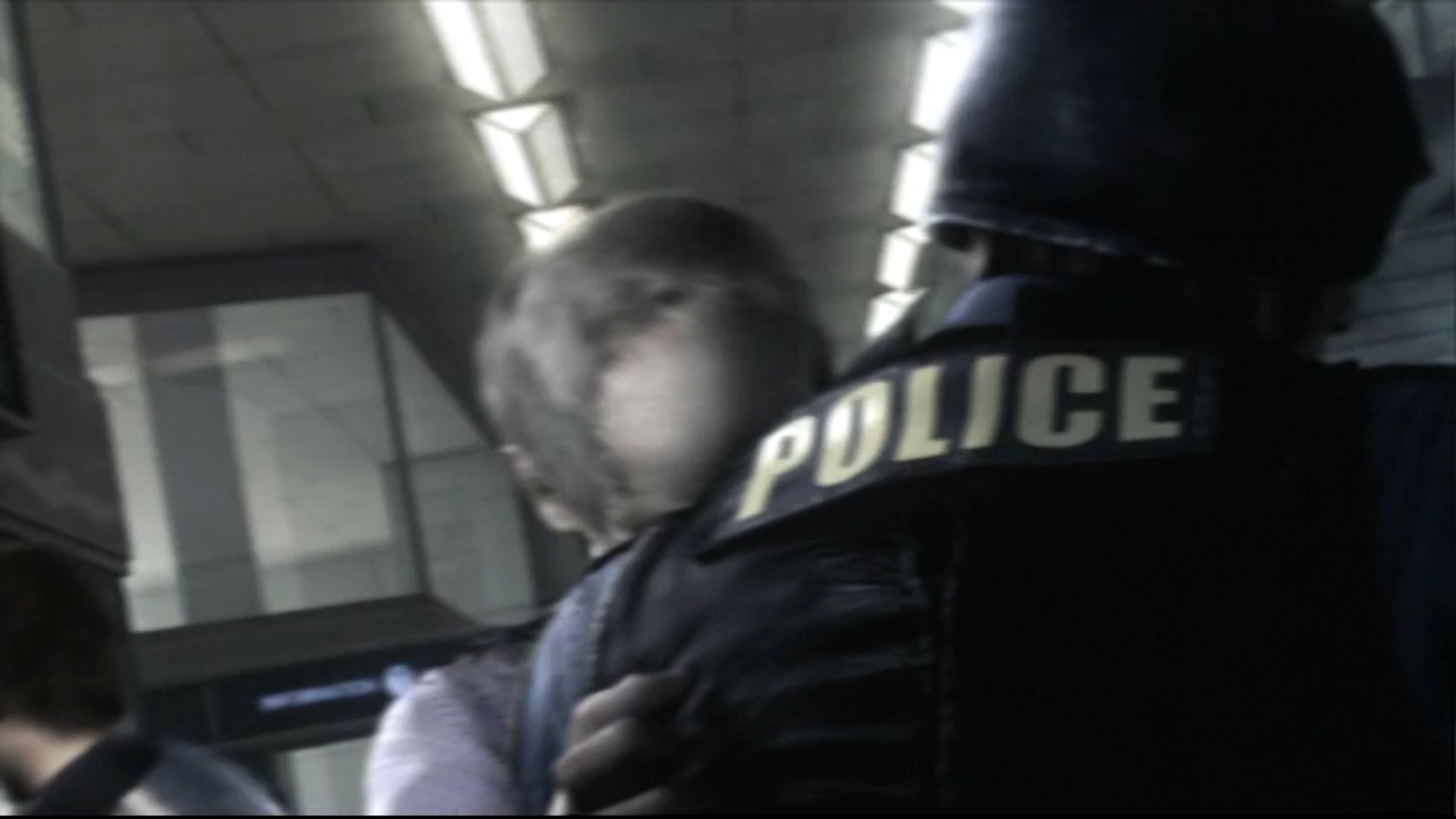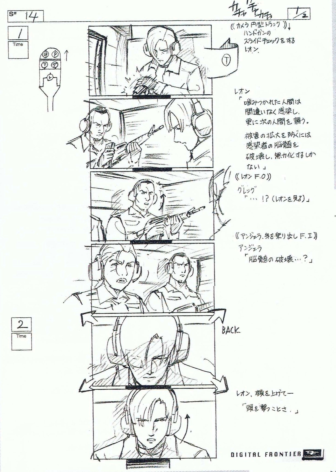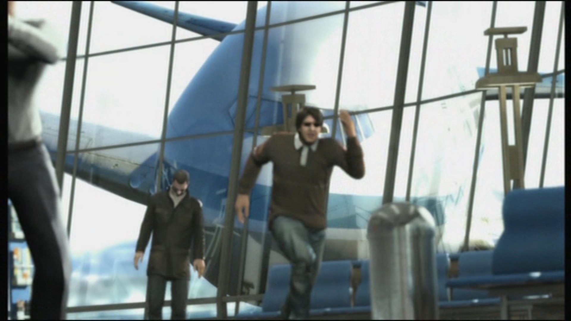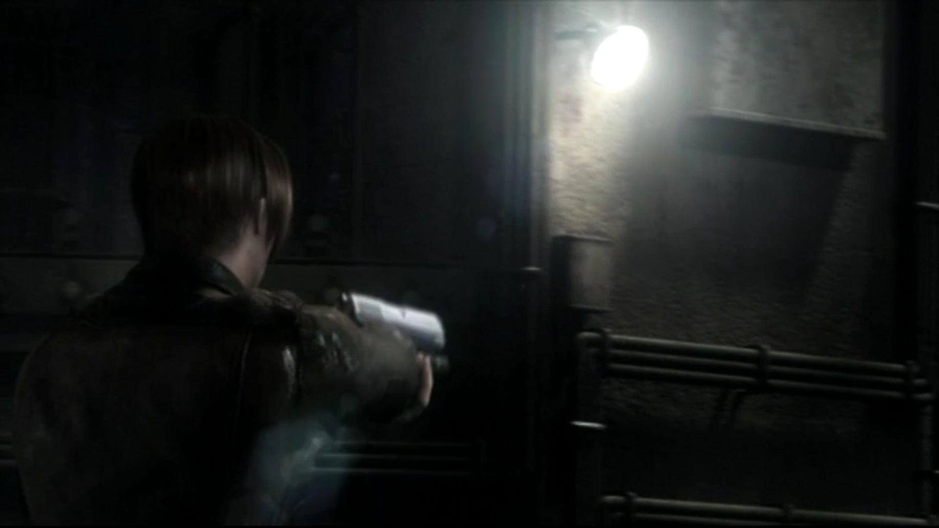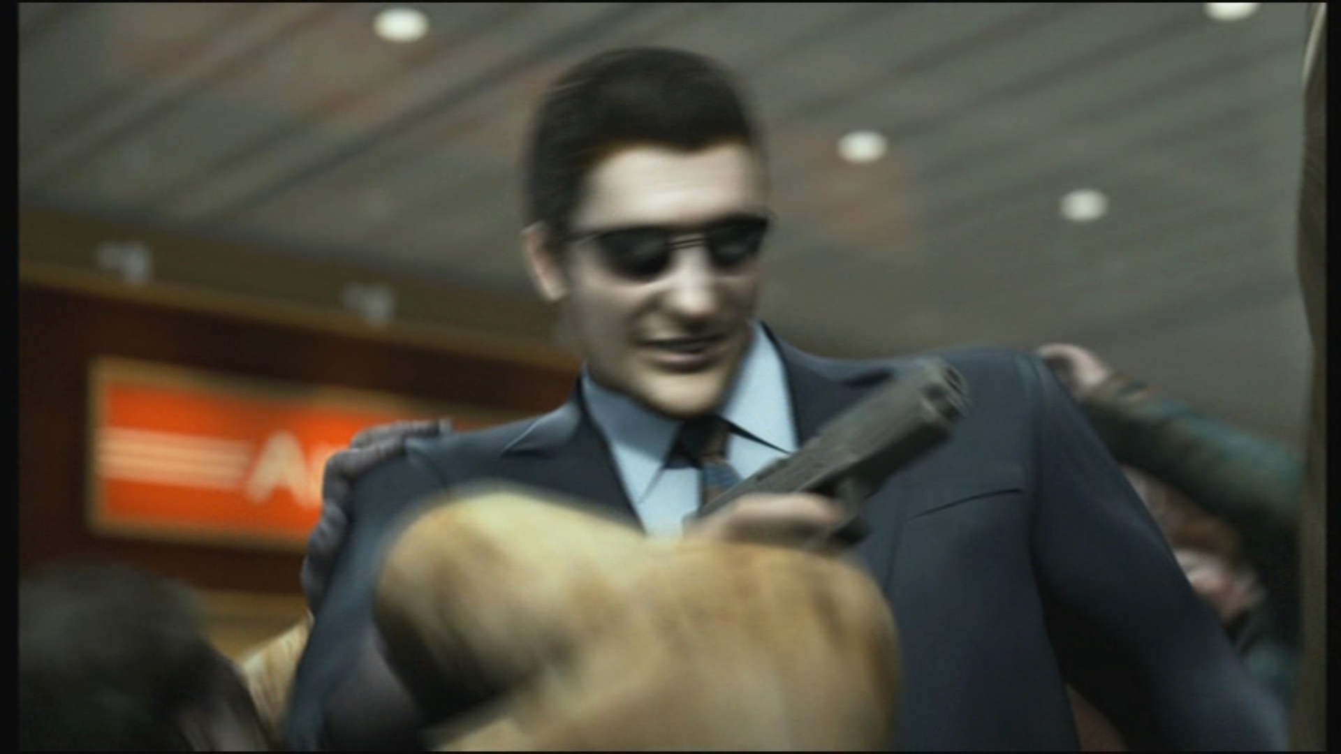 - Леон целится в дверь и стреляет по замку. Нельзя точно сказать, относится ли данный кадр к сценке в аэропорту, ведь в игре был момент, когда Леон отправлялся в подземные пути аэропорта.