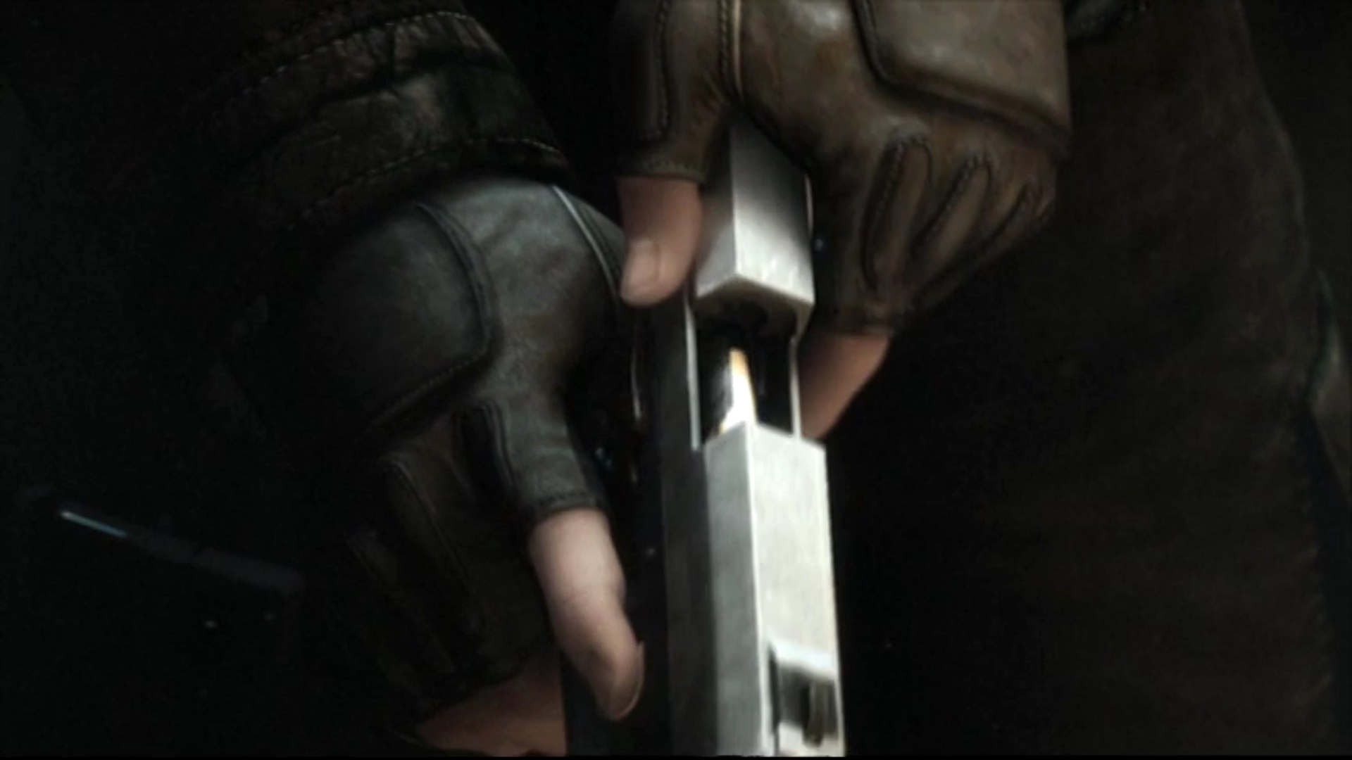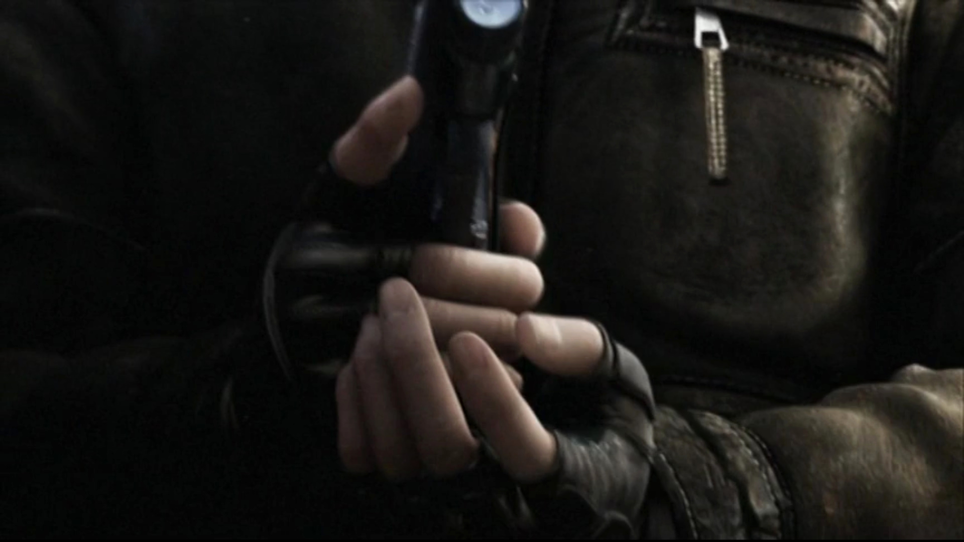 Дальше – Леон, перезаряжающий пистолет. Данный кадр был в фильме тогда, когда Леон с командой летят на вертолёте и тот проводит инструктаж по выживанию. Момент перезарядки приближен к рукам.