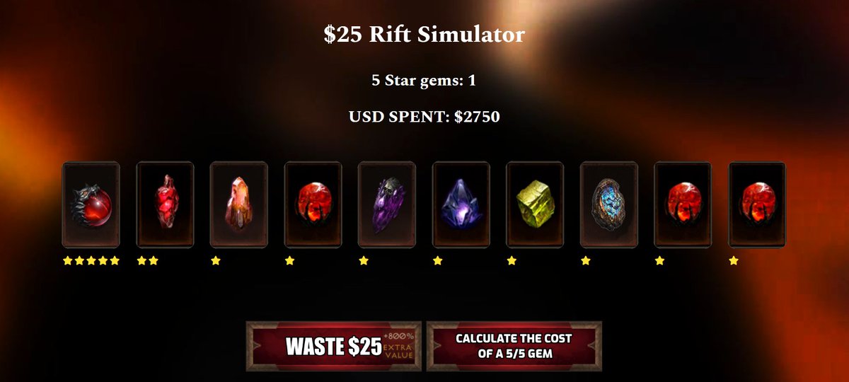 Вложение в Diablo Immortal денег может быть сомнительной затеей: судя по экспериментам игроков, шансы на получение 5-звездных самоцветов крайне невелики. Для тех, кто хочет убедиться в этом самостоятельно, разработчик под ником dimi777 создал симулятор закидывания денег в игру.
