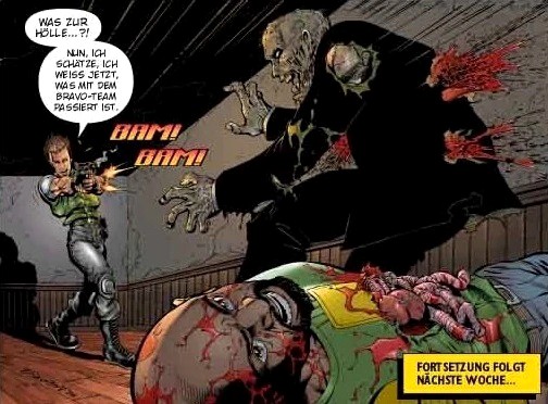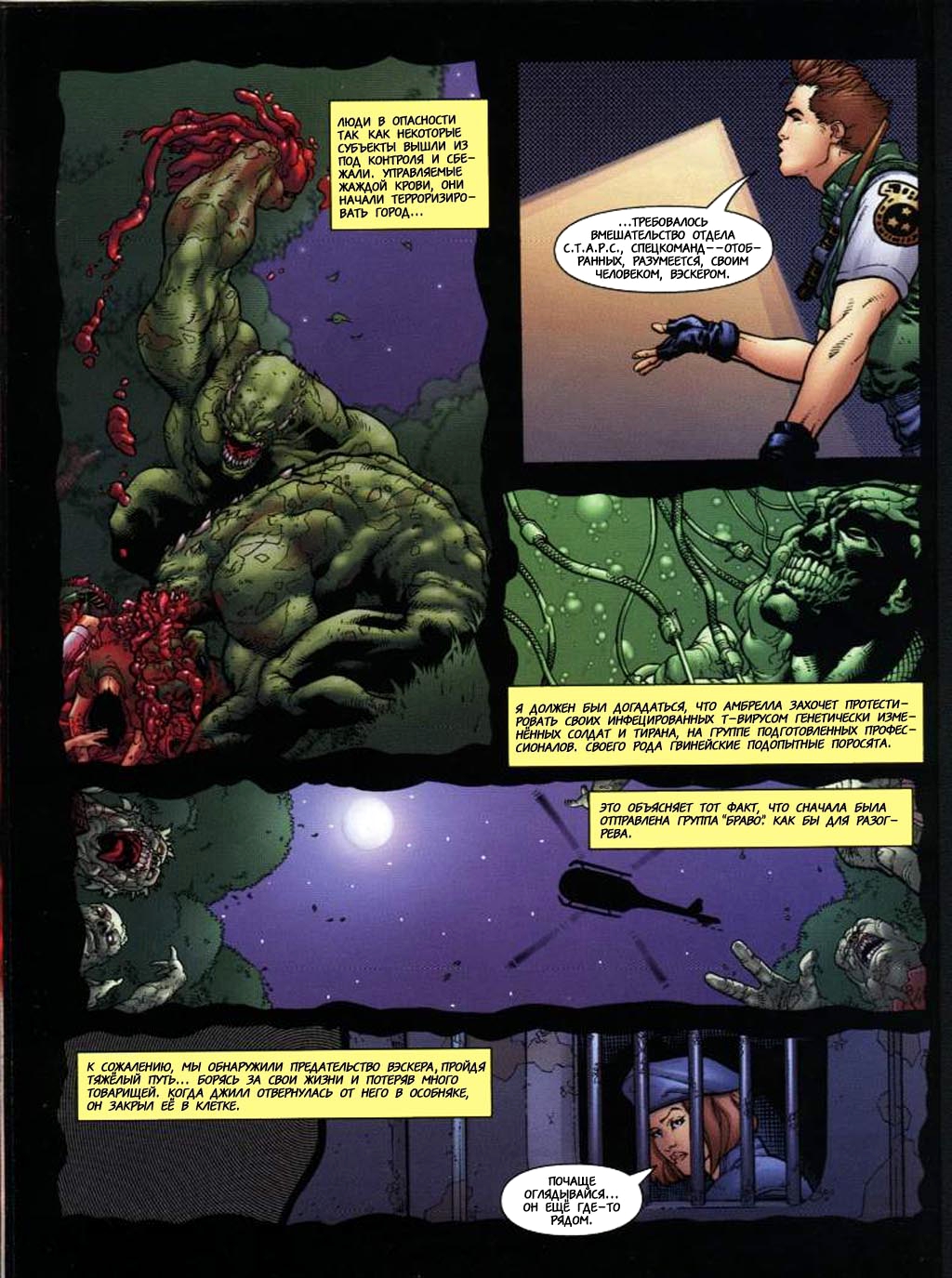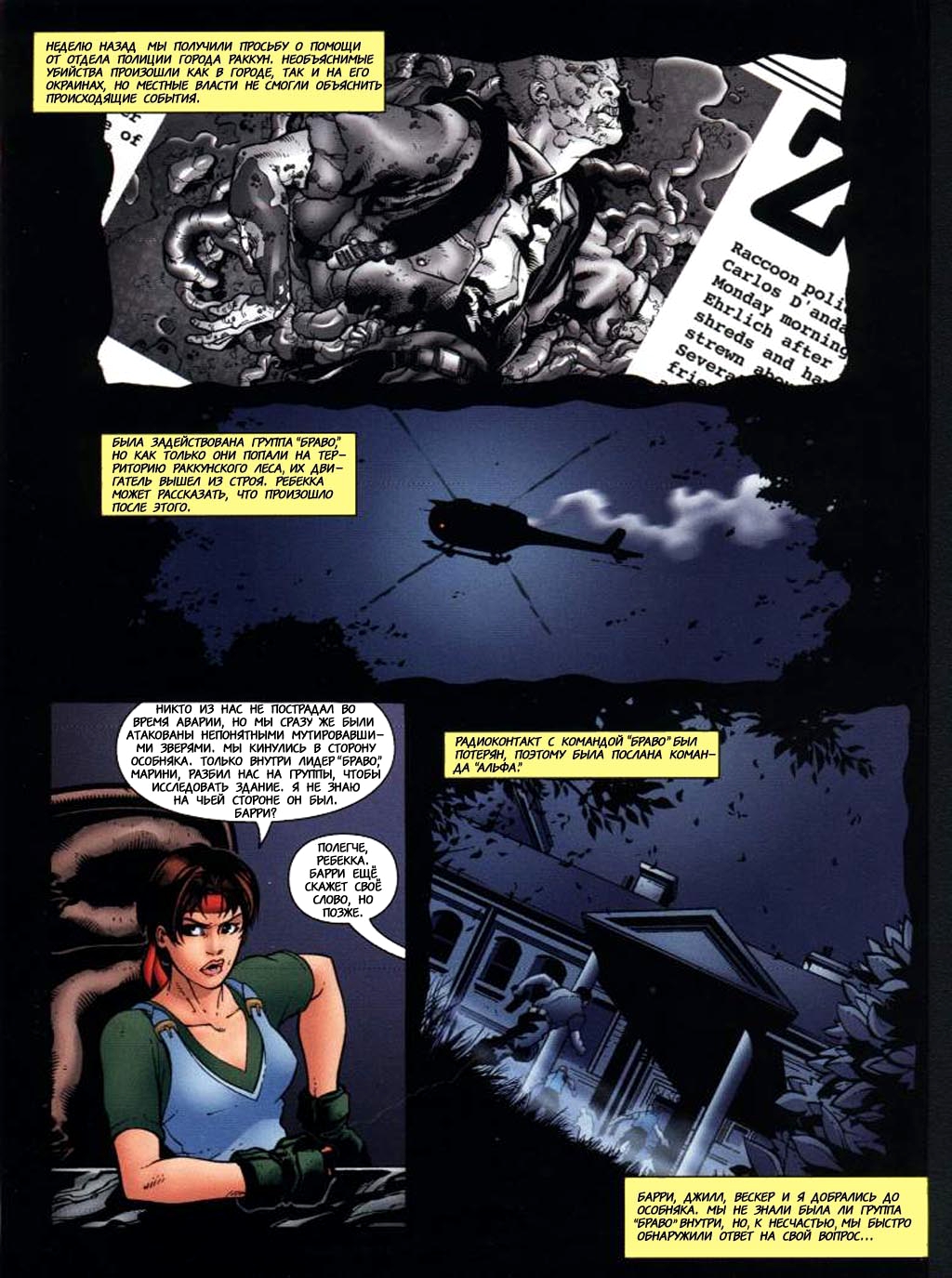 Снова возвращаемся к команде Альфа. Вескер собрал всех и дал инструктаж, после чего, вся команда выдвигается на вертолётную площадку, где Вескер отдаёт команду Крису – погрузить ракеты в вертолёт. Тем самым, комикс как-бы поясняет, откуда в финальном бое с Тираном, Брэд скидывает ракетницу и почему она вообще оказалась в вертолёте.
