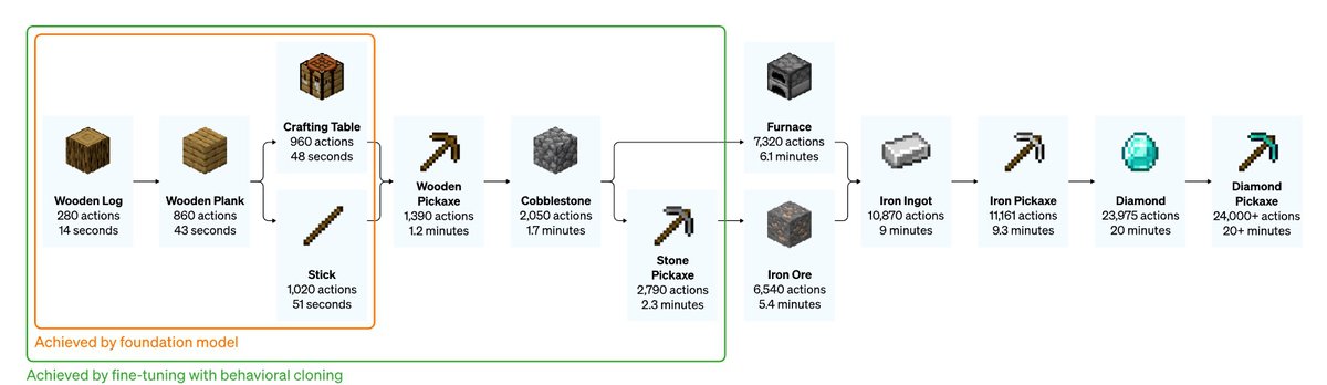 Для этого искусственному интеллекту пришлось предпринять больше 24 тысяч действий, самостоятельно играя в Minecraft на протяжении более 20 минут. Попутно ИИ показал «уровень успеха на уровне игрока-человека» в добыче всех необходимых предметов.