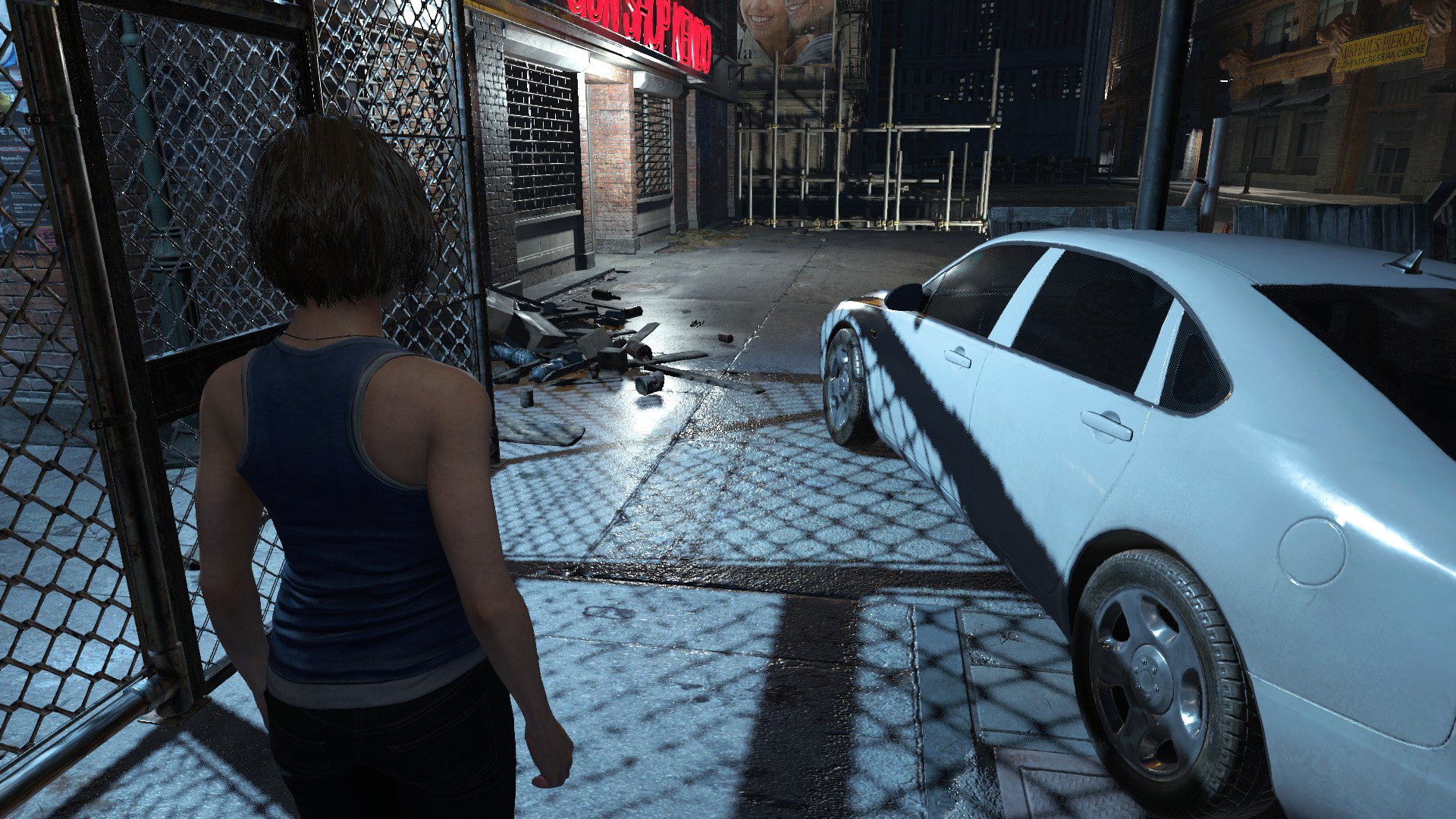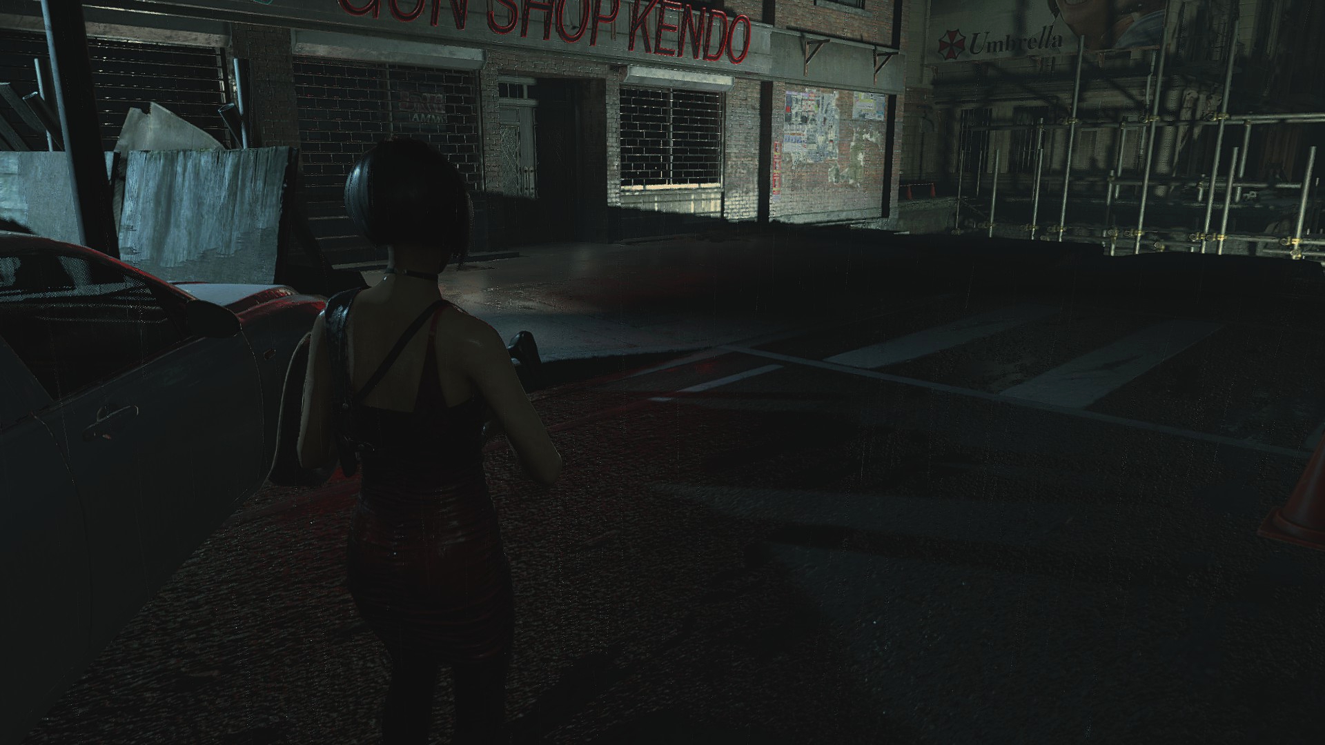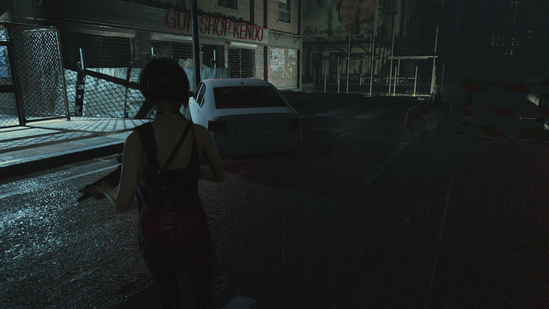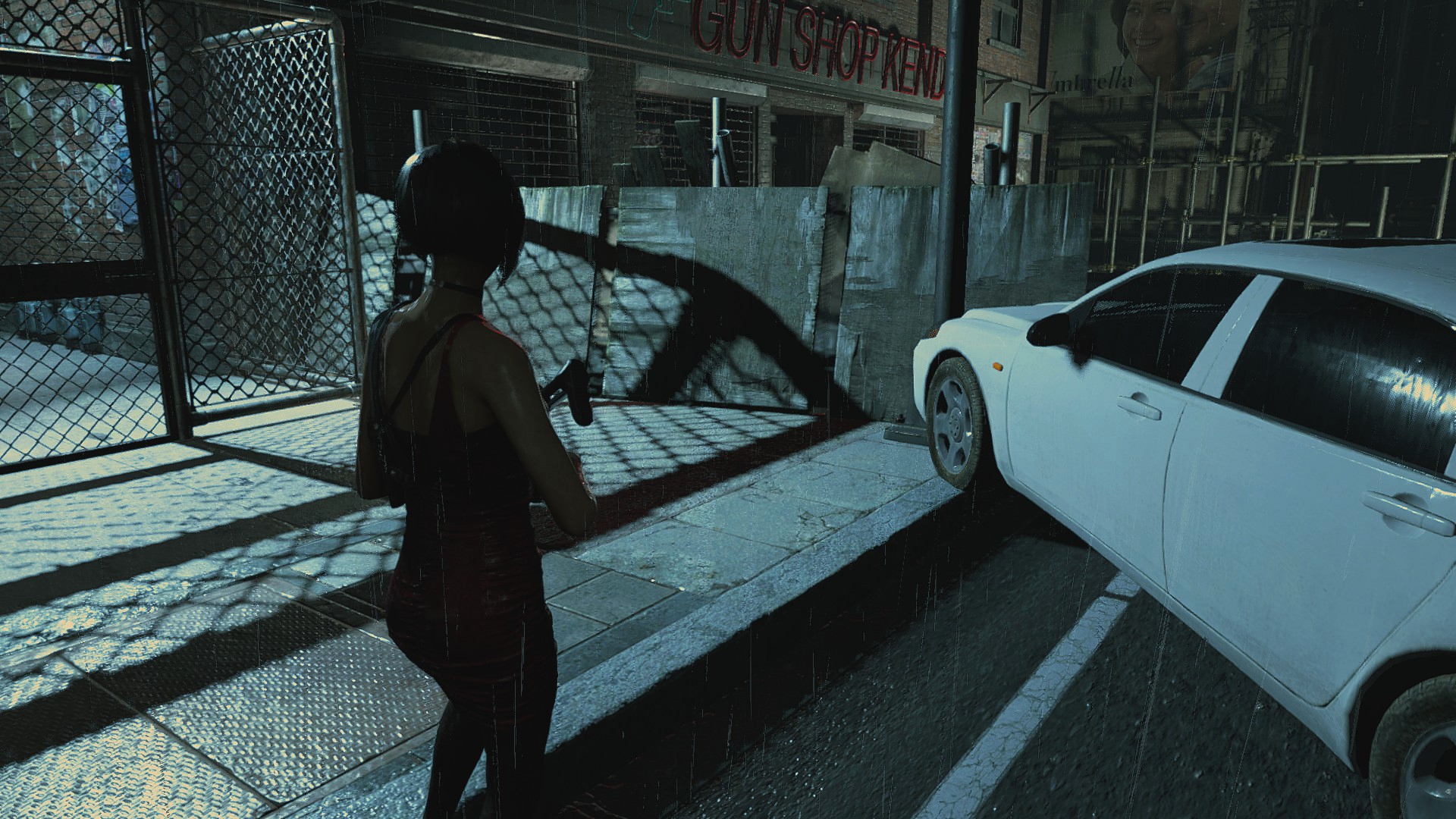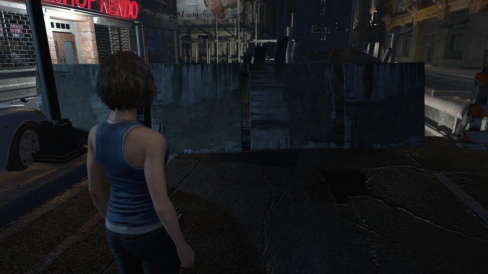 Ещё странности поджидают нас возле магазина Кендо, ибо там машина и баррикады переставлены... Более того, проход сзади магазина тоже был изменён, что идёт вразрез логике второй части. Выпилили забор, забросали лестницу мусорными пакетами и всё это для того, чтобы игрок не забрёл в другую части локации... Очень тупое решение, да и пройтись по локации из Resident Evil 2 всё-таки можно, используя тренер!