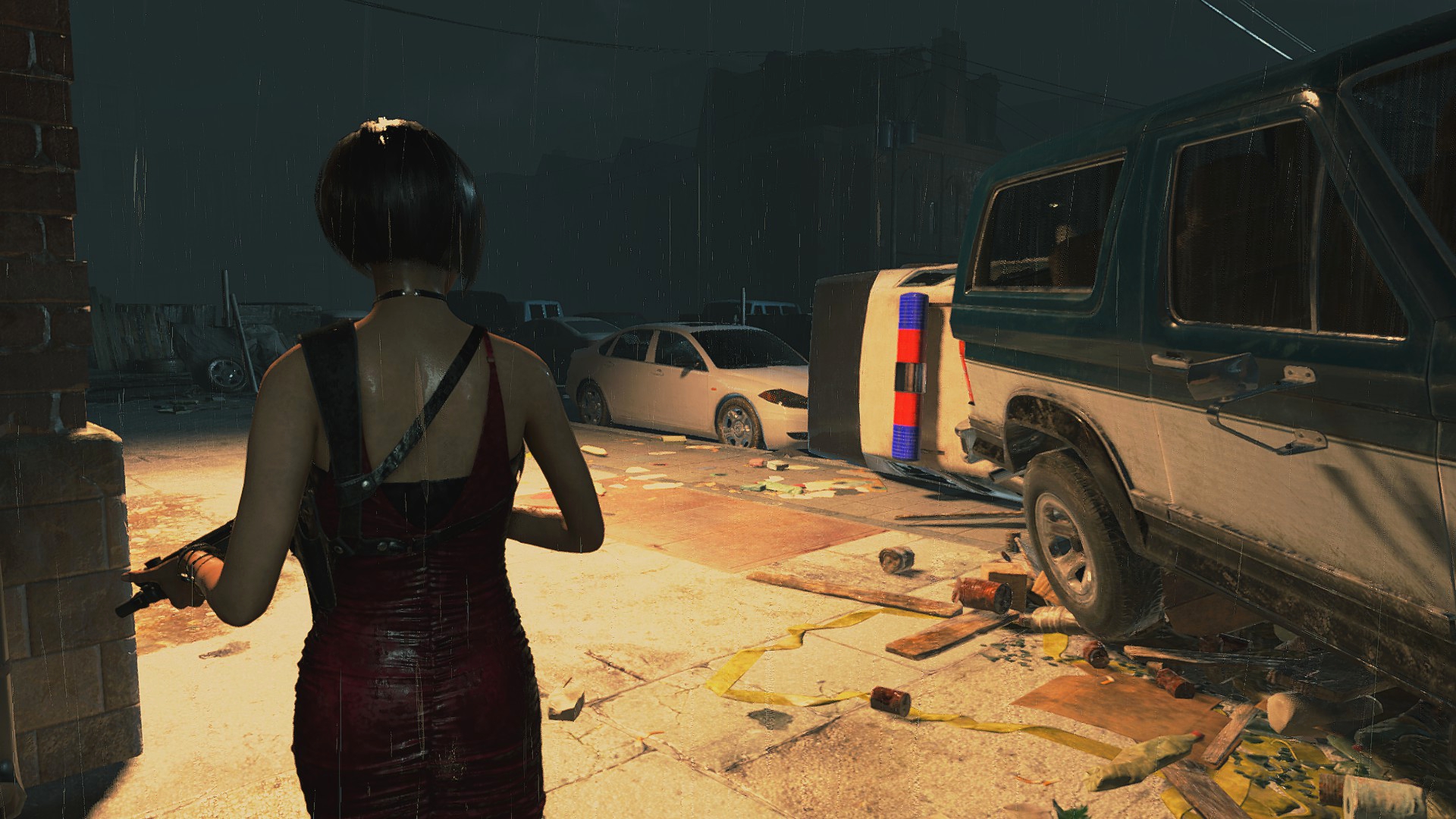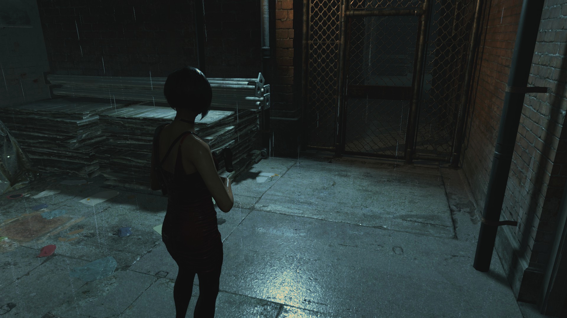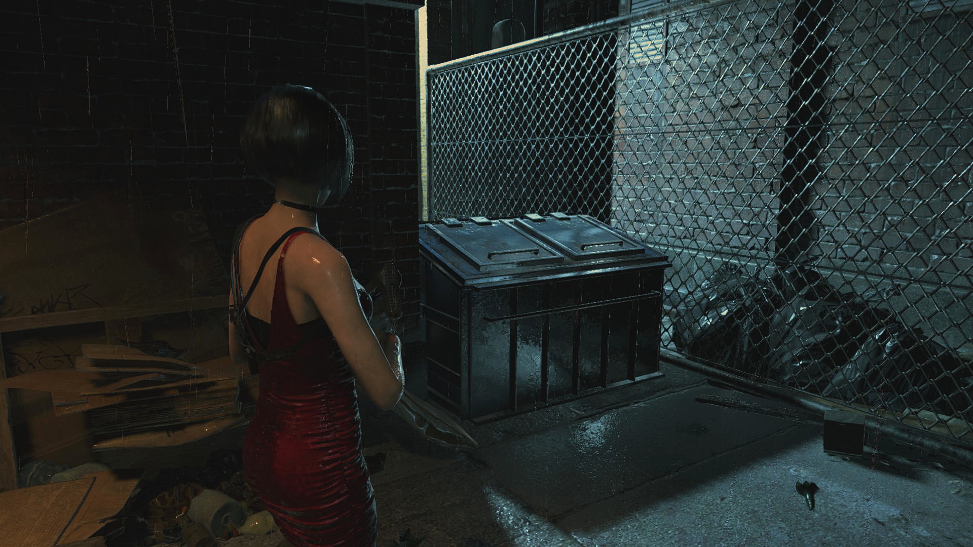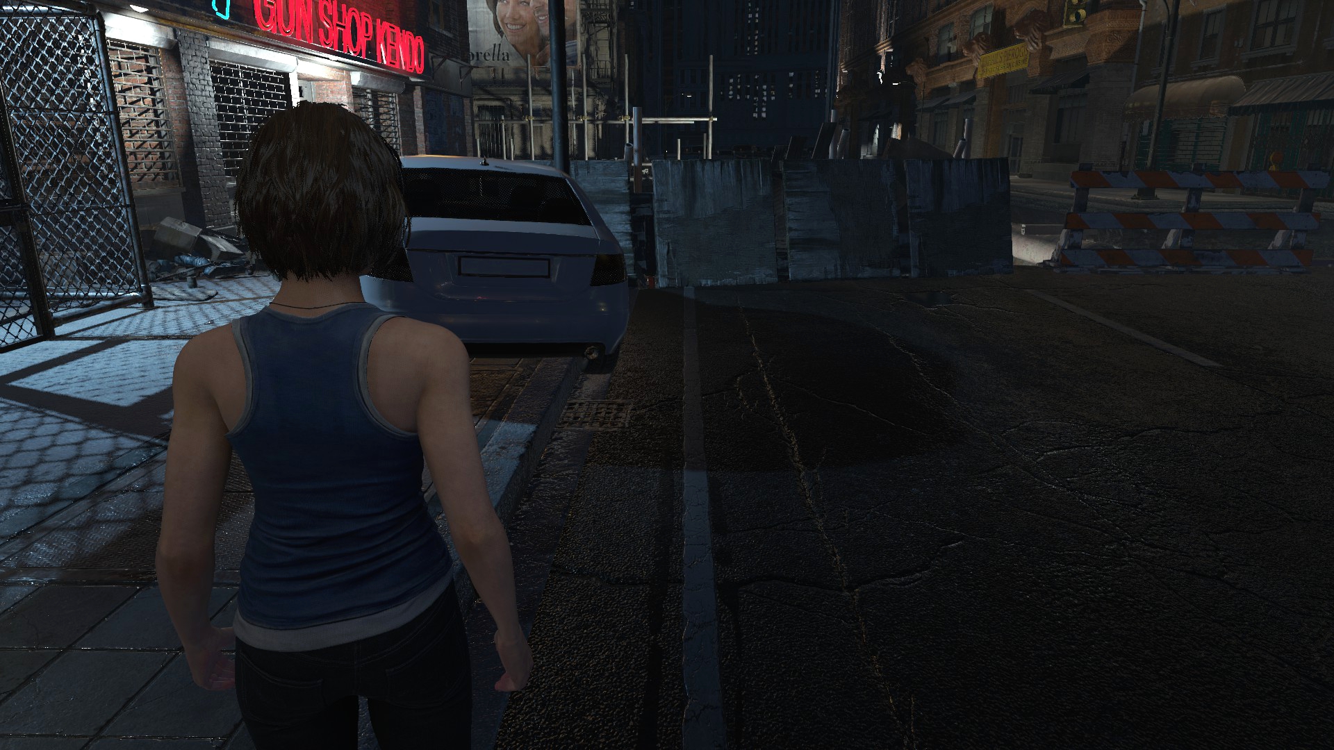 Ещё странности поджидают нас возле магазина Кендо, ибо там машина и баррикады переставлены... Более того, проход сзади магазина тоже был изменён, что идёт вразрез логике второй части. Выпилили забор, забросали лестницу мусорными пакетами и всё это для того, чтобы игрок не забрёл в другую части локации... Очень тупое решение, да и пройтись по локации из Resident Evil 2 всё-таки можно, используя тренер!