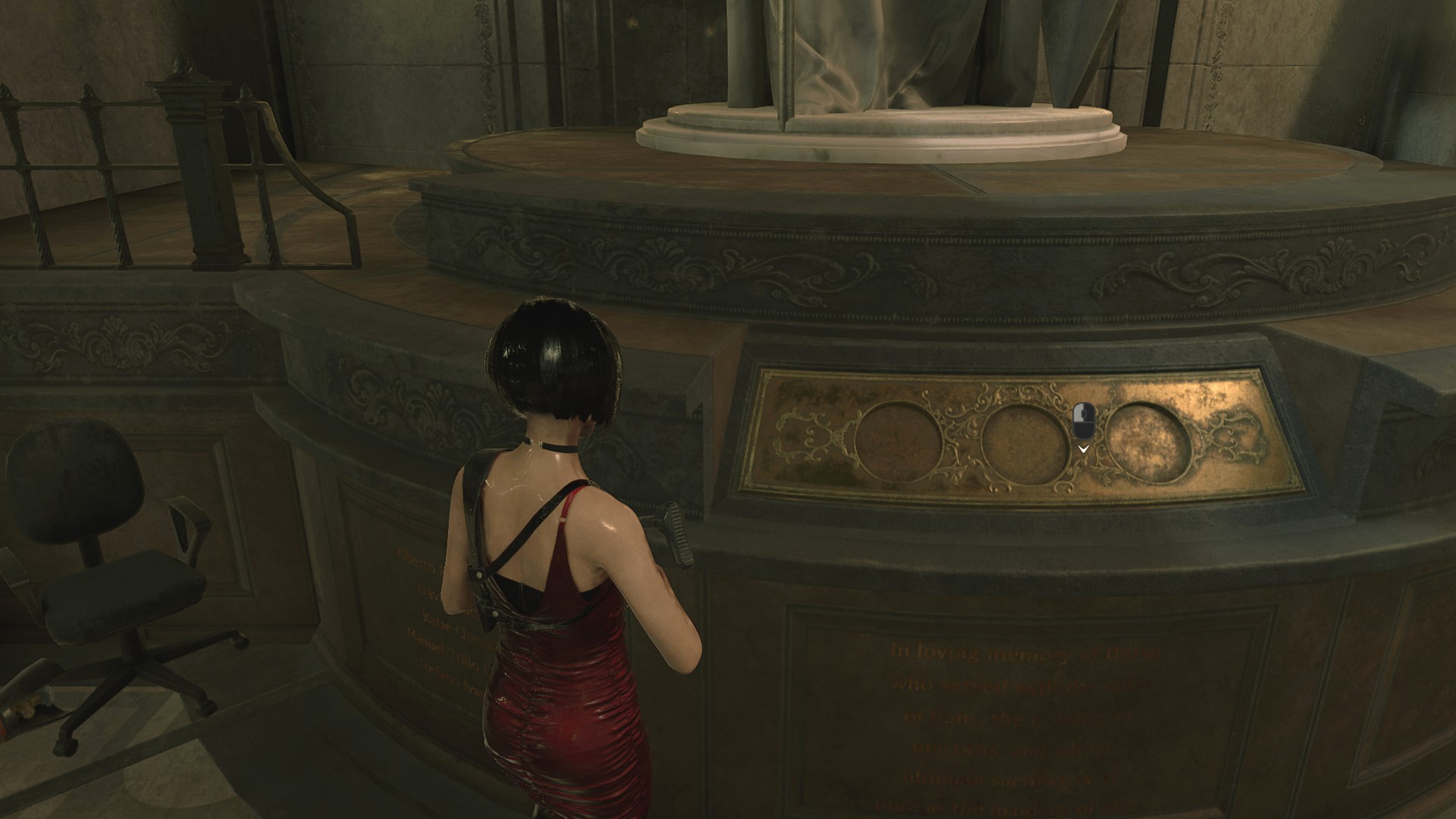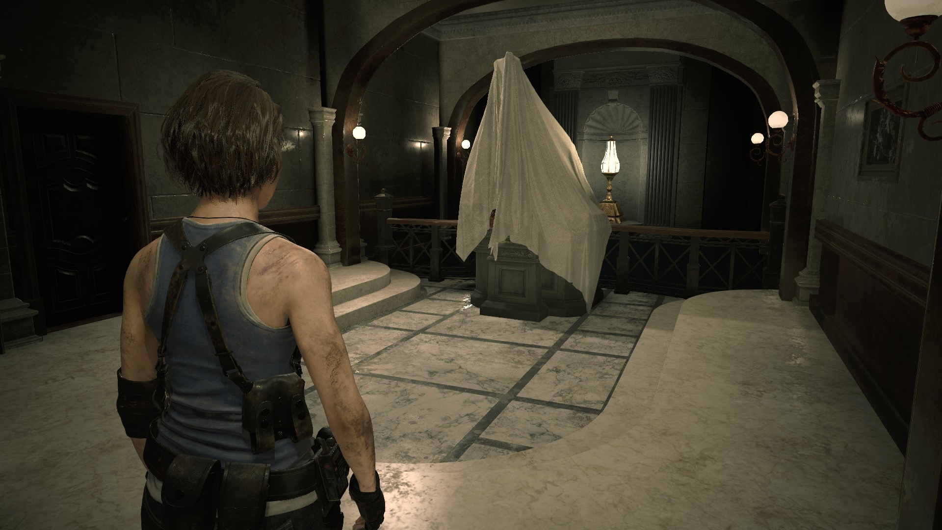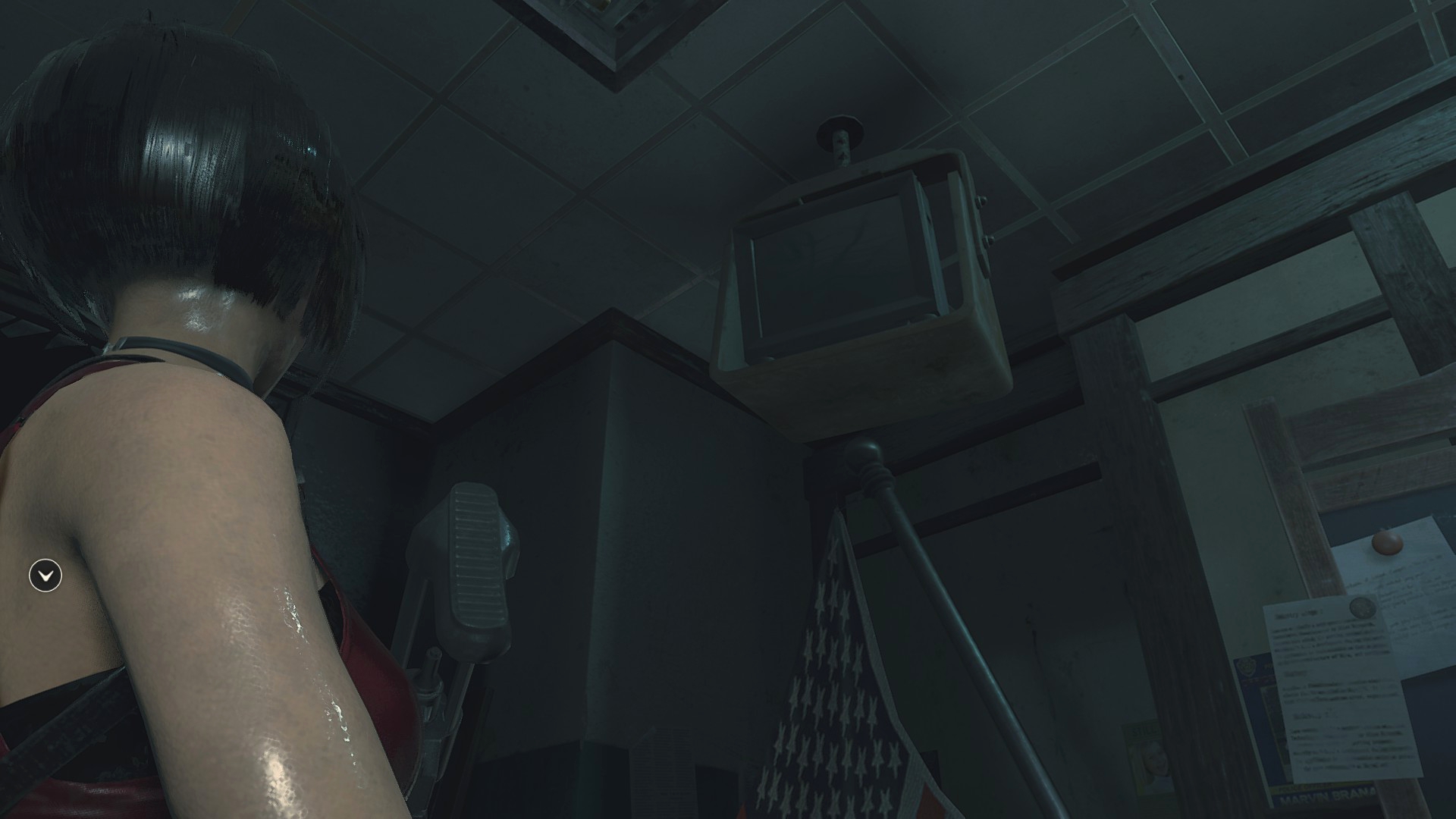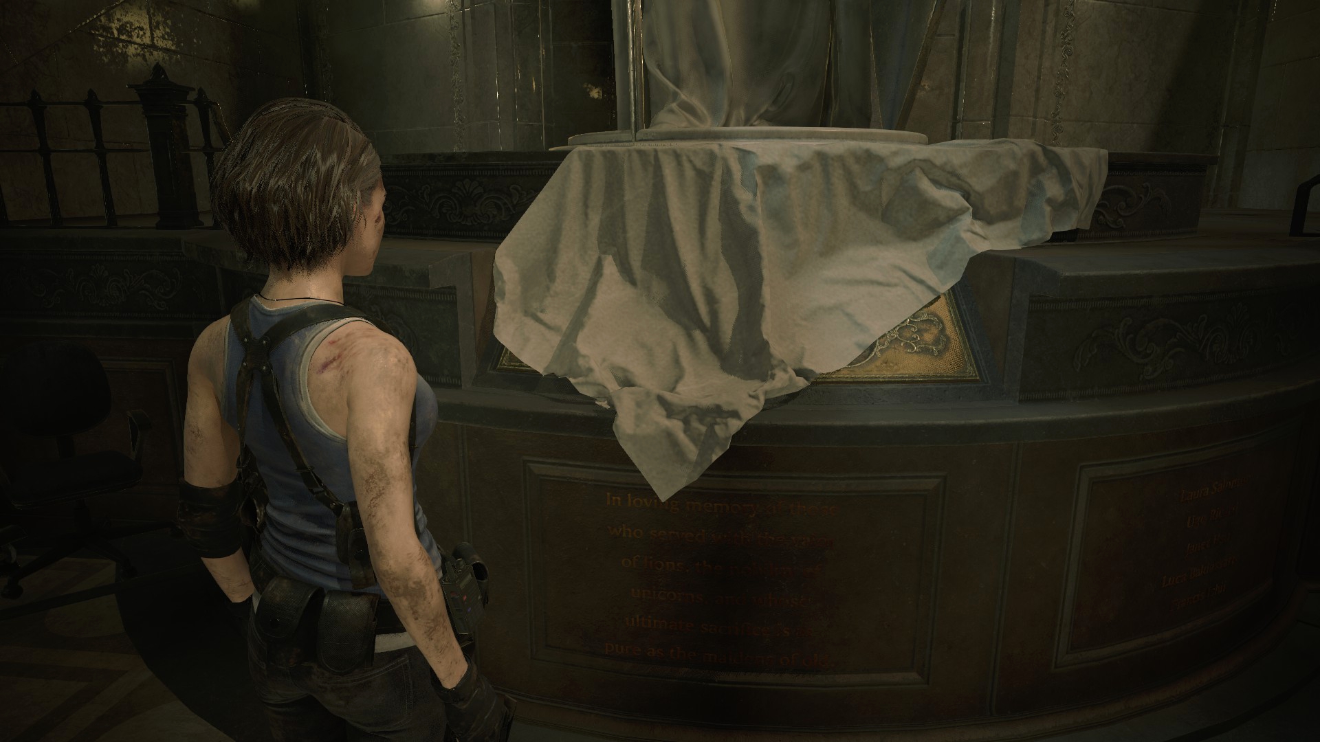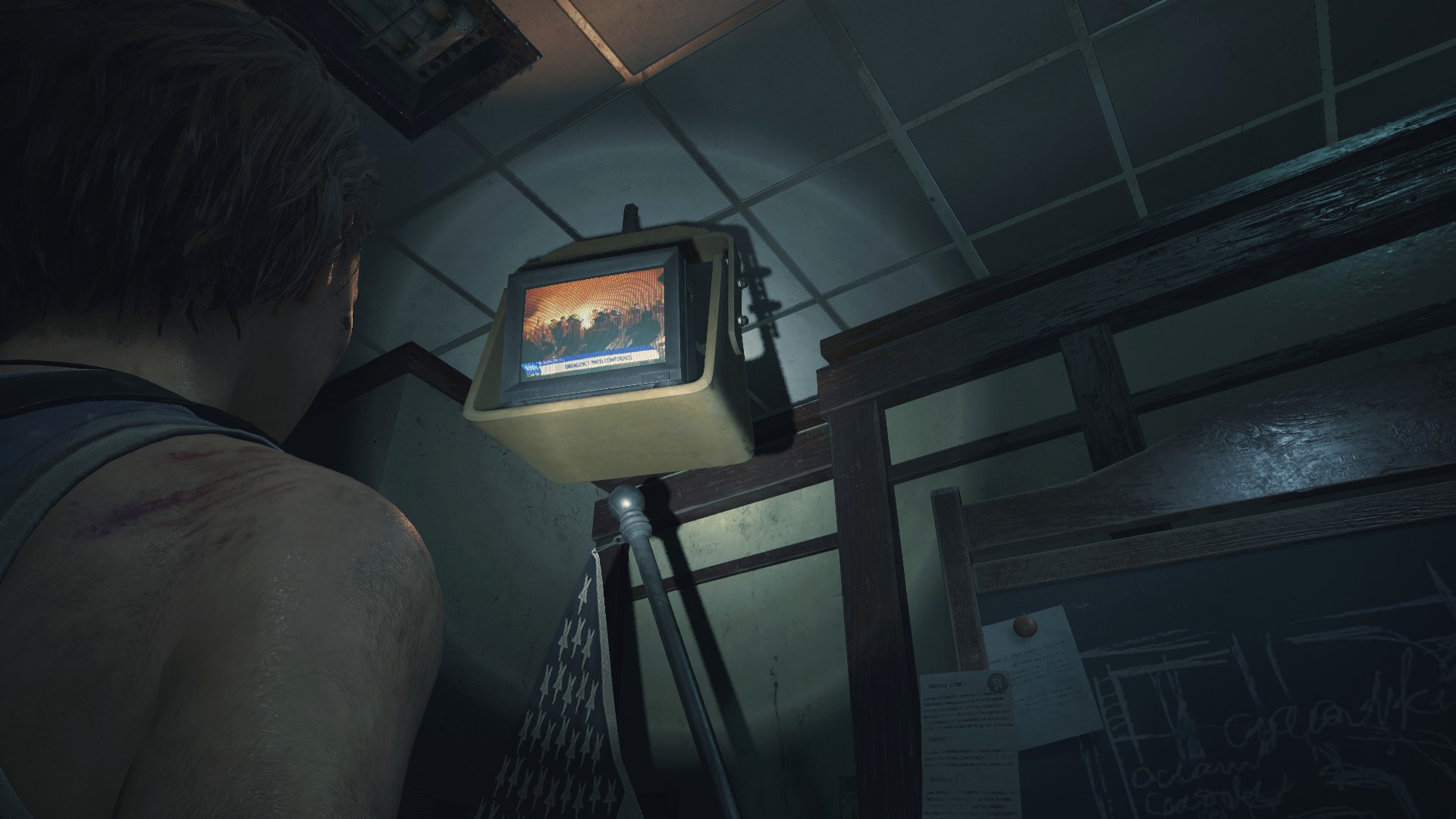 Пройдя в конференц-зал можно обнаружить, что телевизоры работают, по ним показывают беспорядки в Раккун-Сити, поддоны убраны, а дверь, которая во второй части закрыта на цепь – открыта, а цепь сброшена на пол! Как мне кажется, это сильный недочёт игре, ибо события первой половины Resident Evil 3, протекают до событий Resident Evil 2!