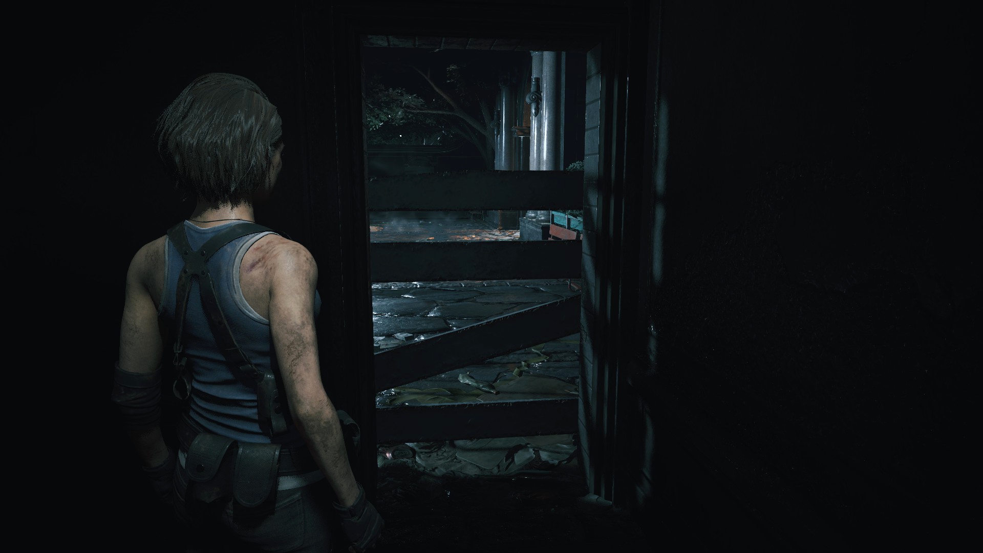 Выйдя из офиса S.T.A.R.S. и попытавшись войти в библиотеку, мы заметим, что проход заблокирован, а крови на стенах ещё нет... Крови нет, а вот разрушения на локации присутствуют.