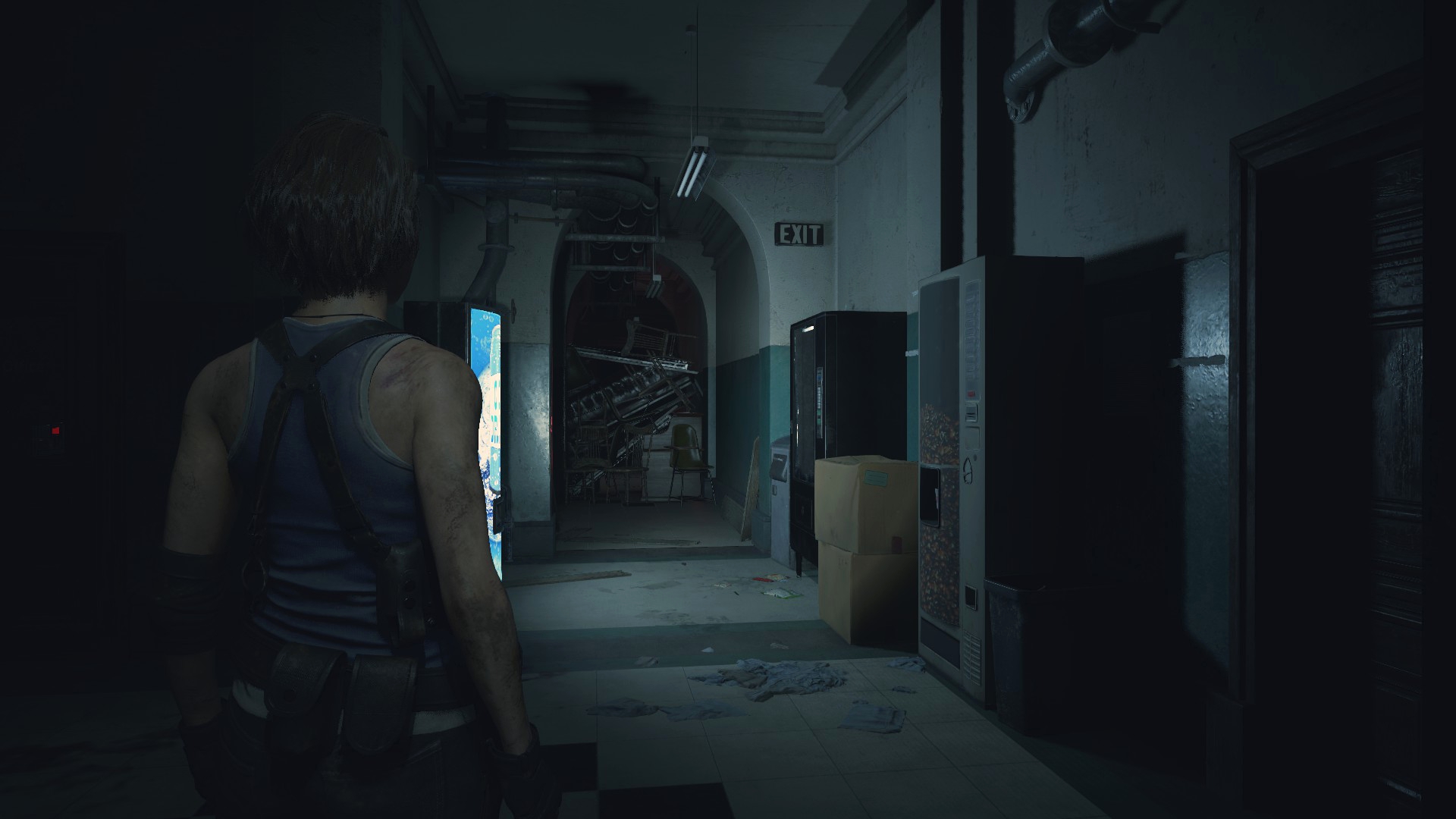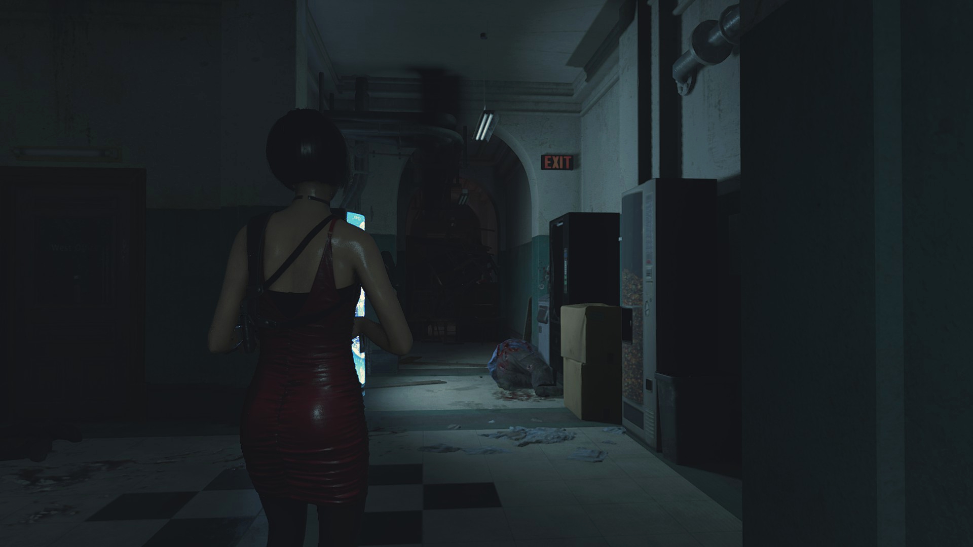 Выйдя из конференц-зала, мы наблюдаем тех же самых зомби, что и во второй части игры. Меня всегда доставлял зомби, который бьёт автомат с газировкой... Кто ж знал, что я там замечу отличие в вывеске "EXIT"? Она из красного цвета, стала белой и это не свечение, в файлах игры она тоже красного цвета.