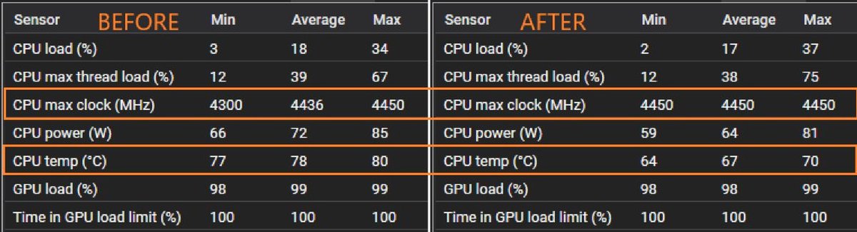 Примечательно, что благодаря более эффективному охлаждению энергопотребление процессора немного снизилось, а частота всегда стала держаться на уровне 4450 МГц.