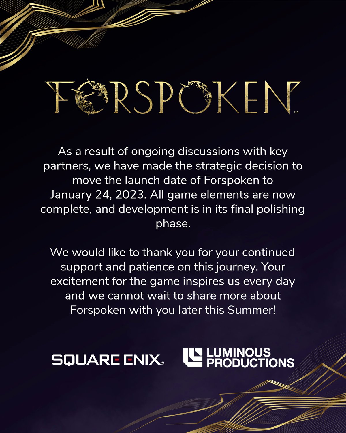 Square Enix сдвинула релиз приключенческого экшена Forspoken с 11 октября 2022 года до 24 января 2023 года. Решение принято после «обсуждения с ключевыми партнерами».