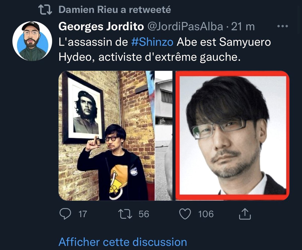 Затем фотографии Кодзимы, тоже в контексте убийства Абэ, заметили в твиттере еще одного француза JordiPasAlba; эта запись была ретвитнута Рю.