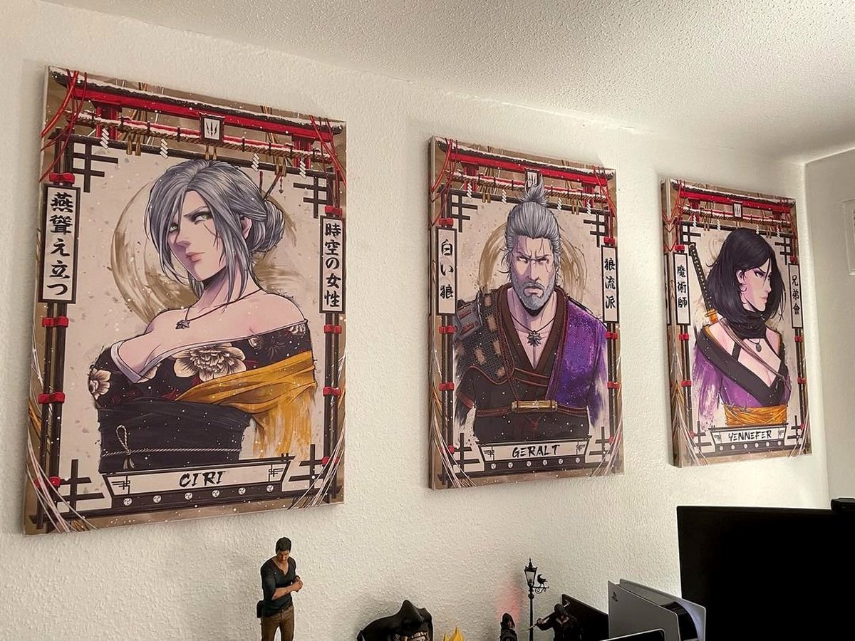 Кому-то из подписчиков Джони так понравились арты, что он заказал сразу три. Теперь дома у фаната есть мини-галерея персонажей The Witcher 3.