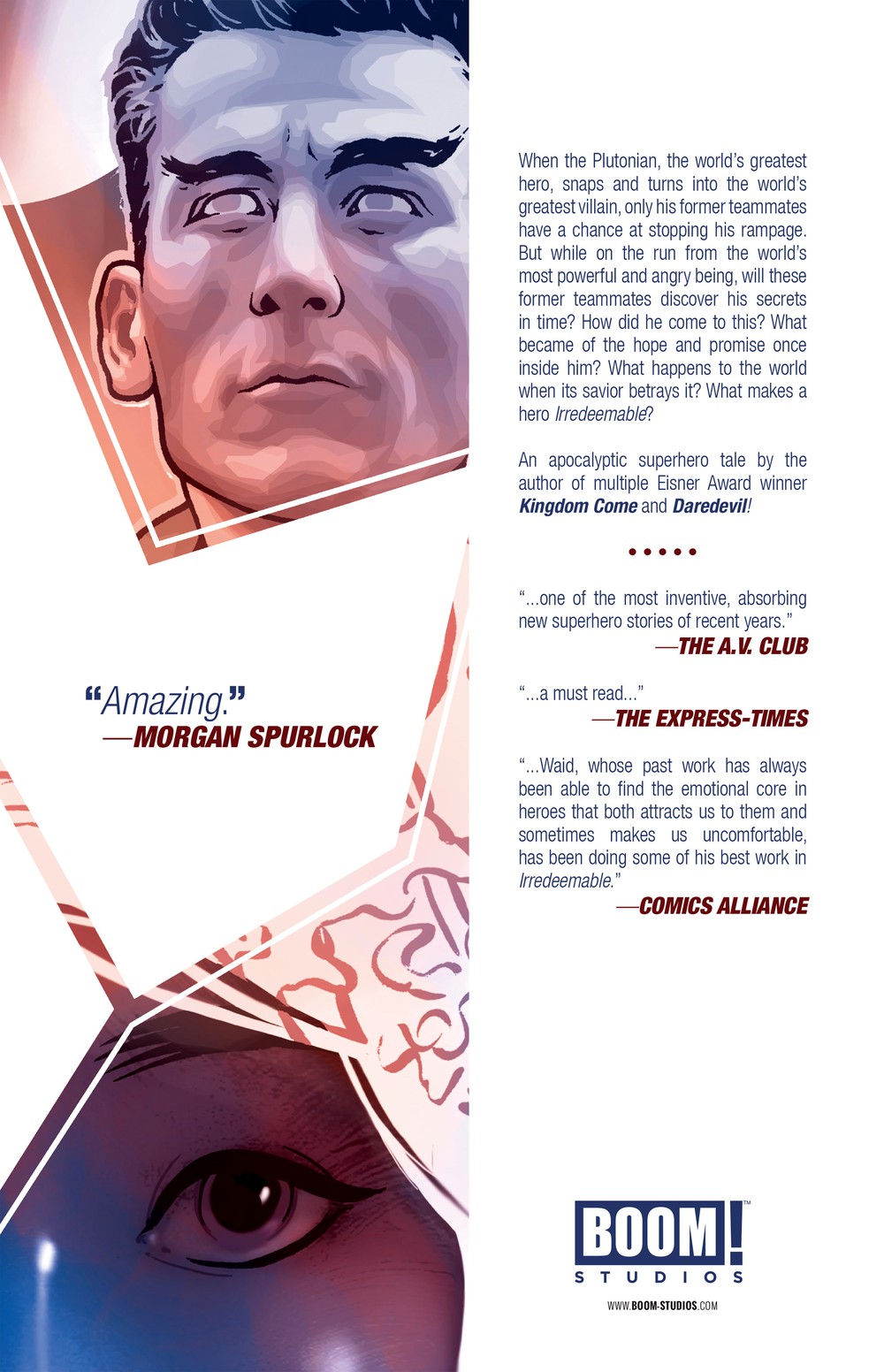 Комикс серия Irredeemable выходила с 2009 по 2012 год. Издателем выступила Boom! Studios, а сценарий писал Марк Уэйд. В своё время автор работал над культовым комиксом Kingdom Come, где Супермен психанул и чуть не разрушил ассамблею ООН.