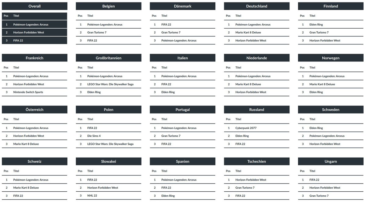 Глобальный общеевропейский топ возглавляет Pokémon Legends: Arceus. Второе место у Horizon Forbidden West, третье — у FIFA 22. Также в чартах часто мелькают Gran Turismo 7 и Mario Kart 8 Deluxe.