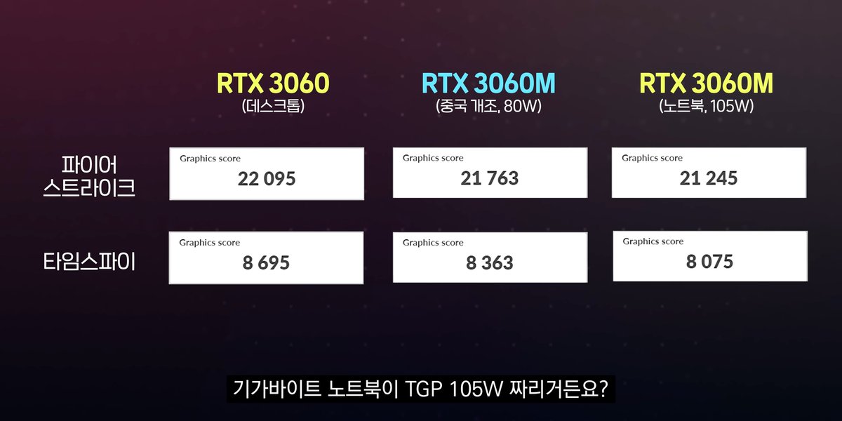 Оказалось, что в бенчмарках GeForce RTX 3060 с мобильным чипом обходит ноутбук с тем же GPU, но слегка уступает десктопной видеокарте.