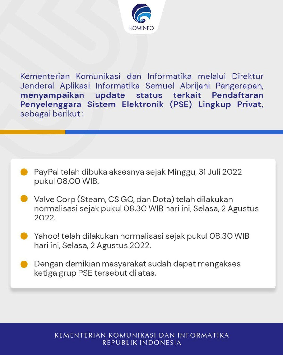 2 августа министерство связи и информационных технологий Индонезии объявило о снятии блокировки со Steam, PayPal и Yahoo. Ведомство отдельно отметило, что у игроков восстановлен доступ к Dota 2 и Counter-Strike Global Offensive.