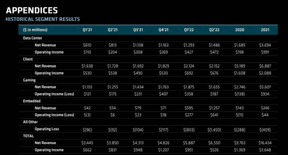 AMD выпустила отчет за второй квартал 2022 года, закончившийся 30 июня. Как и ожидалось, компания сообщила о значительном росте продаж: выручка выросла на 70% к прошлому году, до $6.55 миллиарда.