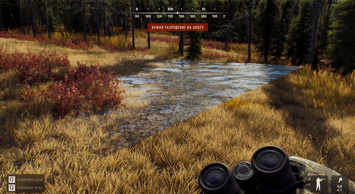 Спустя километр нашему герою одновременно и везет, и нет. Во-первых, после горного перевала мы набредаем на симпатичное озерцо, у которого пасутся олени. Во-вторых, игра сообщает, что для охоты в этом регионе почему-то требуется разрешение. Но вокруг ни души — наверное, в случае чего никто не узнает?