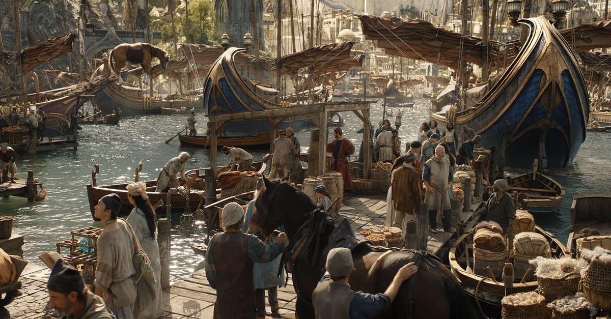 - Нуменорцы технологически продвинуты: на кадре из порта можно заметить сложную систему шкивов, с помощью которой на корабль загружают лошадь. Нуменор обладает технологиями, которых нет у других королевство.