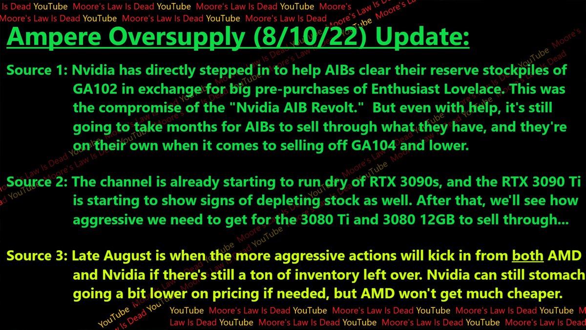 Один из источников отмечает, что запасы GeForce RTX 3090 и RTX 3090 Ti уже более-менее удалось опустошить. С другими видеокартами дела, видимо, обстоят хуже: другой источник полагает, что на опустошение запасов уйдут месяцы.