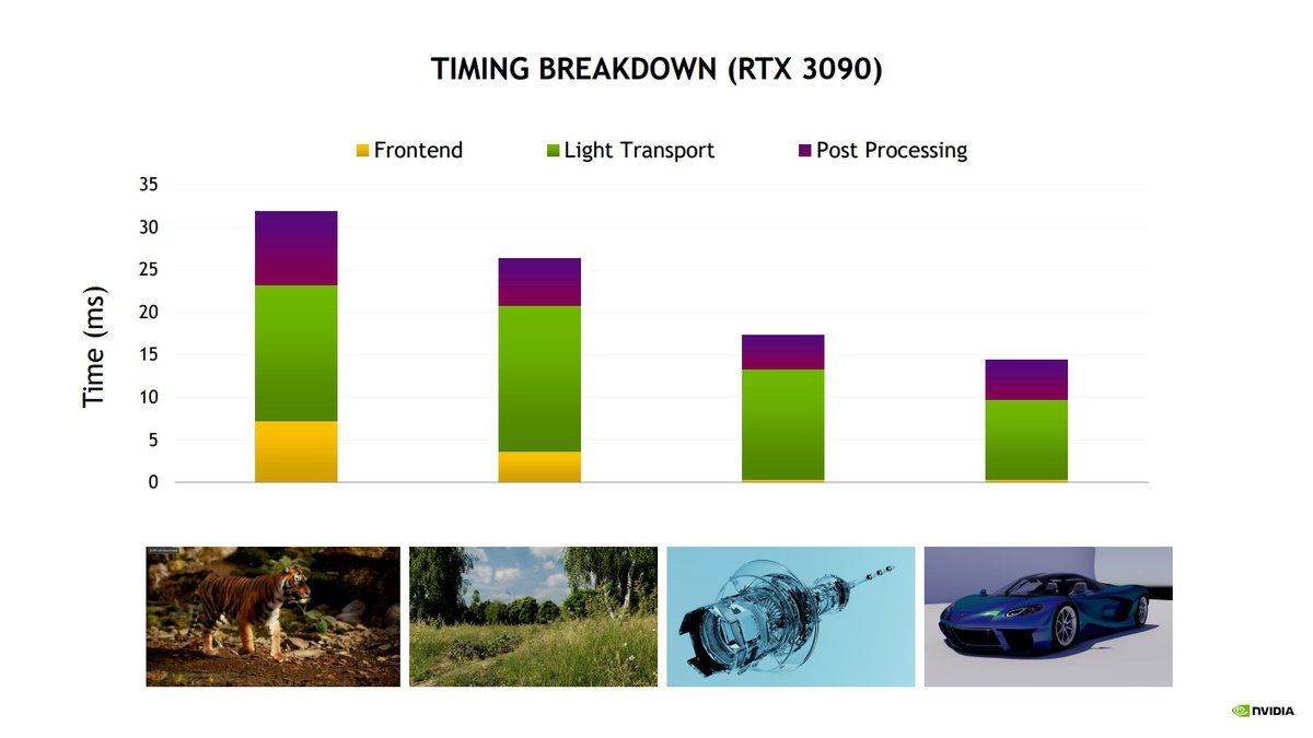 Частота кадров сильно варьируется в зависимости от количества мешей, но даже в сложных сценах, напоминающих фотографии, GeForce RTX 3090 может выдавать больше 30 кадров в секунду.