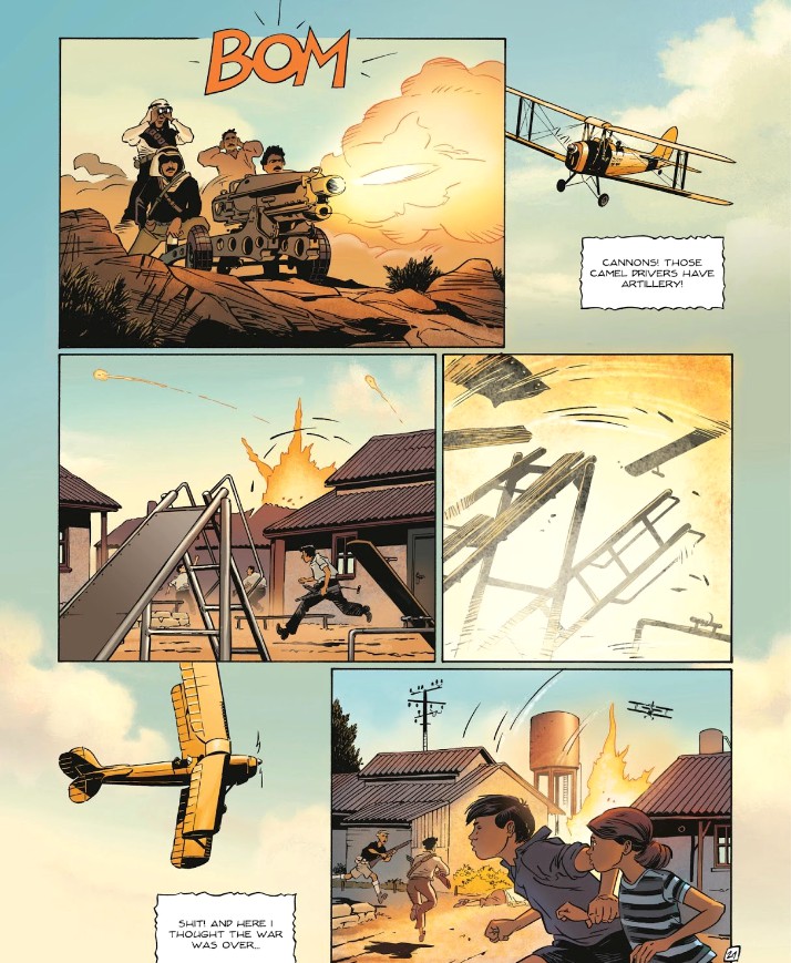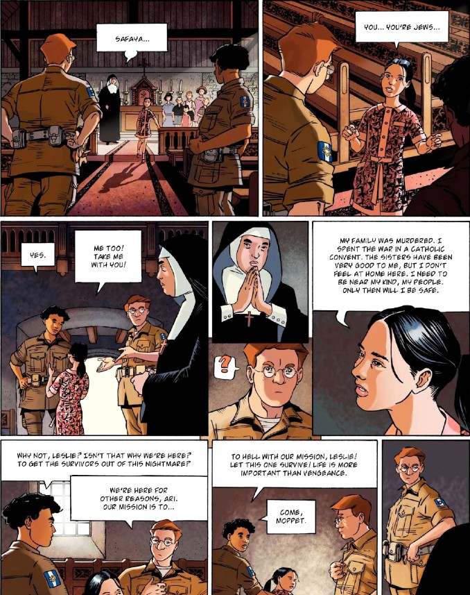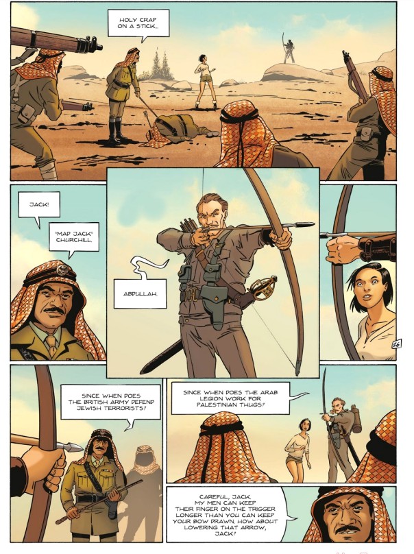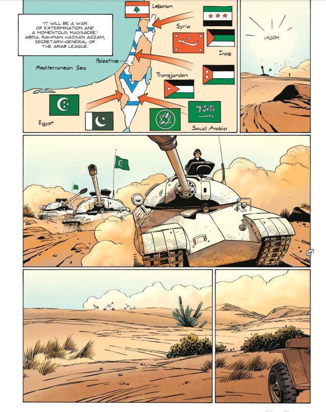 Многим исламским странам эта инициатива не понравилась, но на голосовании они оказались в меньшинстве. Тогда они решили поддержать палестинских арабов силой. Как вы знаете, конфликт не исчерпан до сих пор. Автор комикса встаёт на сторону евреев, главные герои воюют в первых рядах.