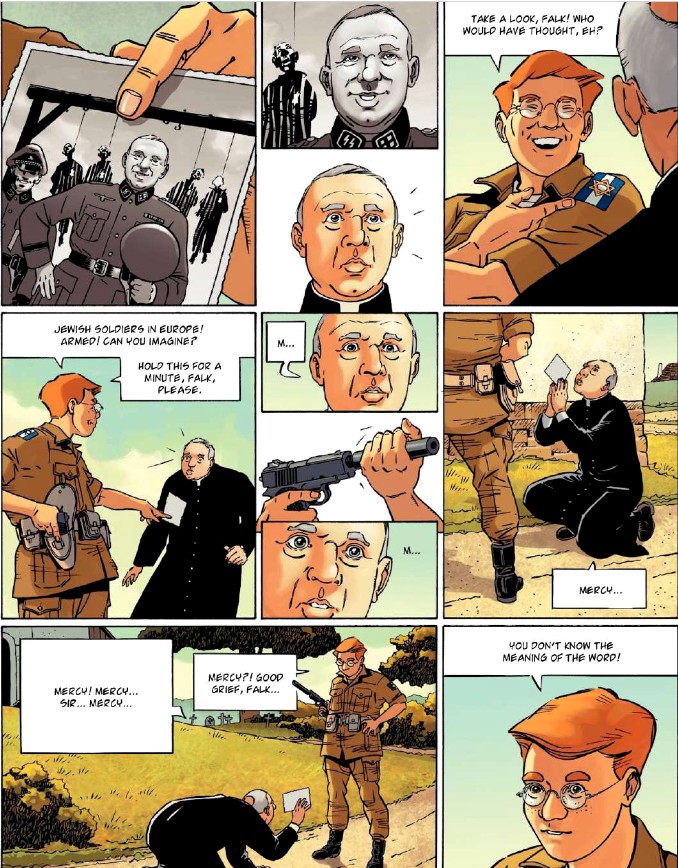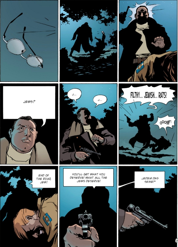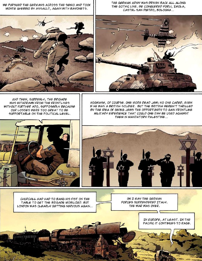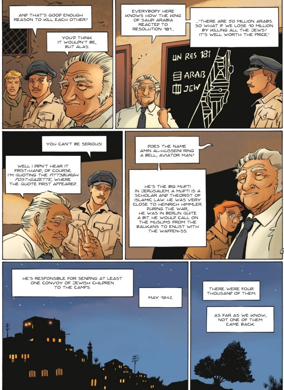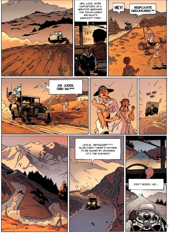 Арабы напрямую сравниваются с нацистами в немых сценах, а текстом комиксист не забывает упомянуть муфтия Амин аль-Хусейни, который действительно был соратником Гитлера и также выступал против создания еврейского государства после Второй мировой. Правда, я никогда не знакомился с творчеством по этой войне, не знаю, насколько это пластинка заезженная.
