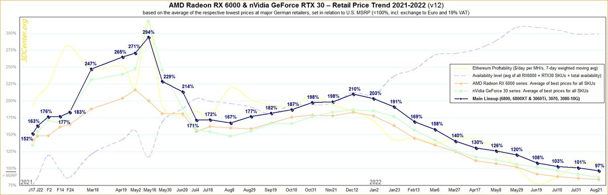 Согласно подсчетам издания, средняя стоимость мейнстримных видеокарт (к ним отнесли GeForce RTX 3060 Ti, RTX 3070, RTX 3080 и Radeon RX 6800/6800 XT) опустилась ниже рекомендуемой впервые за всю историю наблюдений.