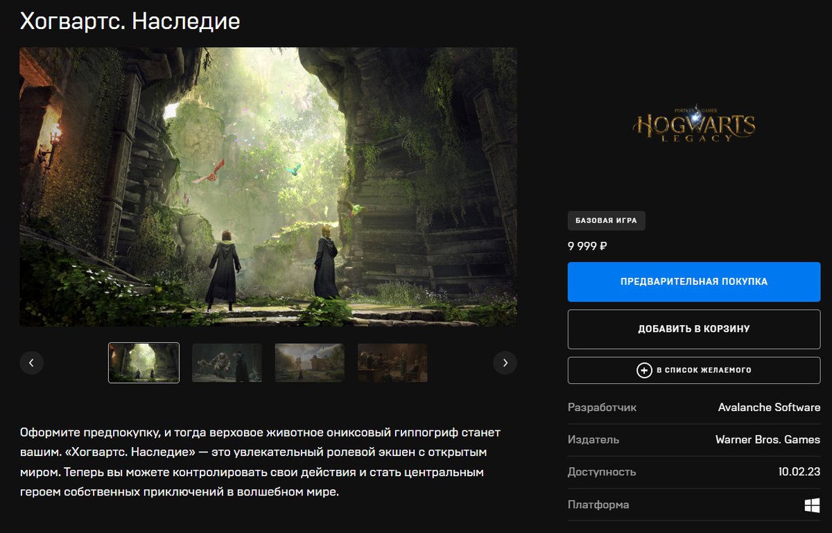 Открылся прием предзаказов на ролевой экшен Hogwarts Legacy. В России у игры интересное ценообразование: версия для PC в Epic Games Store оценивается в 9999 рублей. В Европе игра стоит 59.99 евро, в США — $59.99.