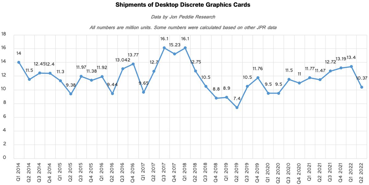 Продажи дискретных видеокарт значительно снизились, сообщает аналитическая компания Jon Peddie Research. Во втором квартале 2022 года было отгружено 10.37 миллиона карт, это худший результат за 2 года.