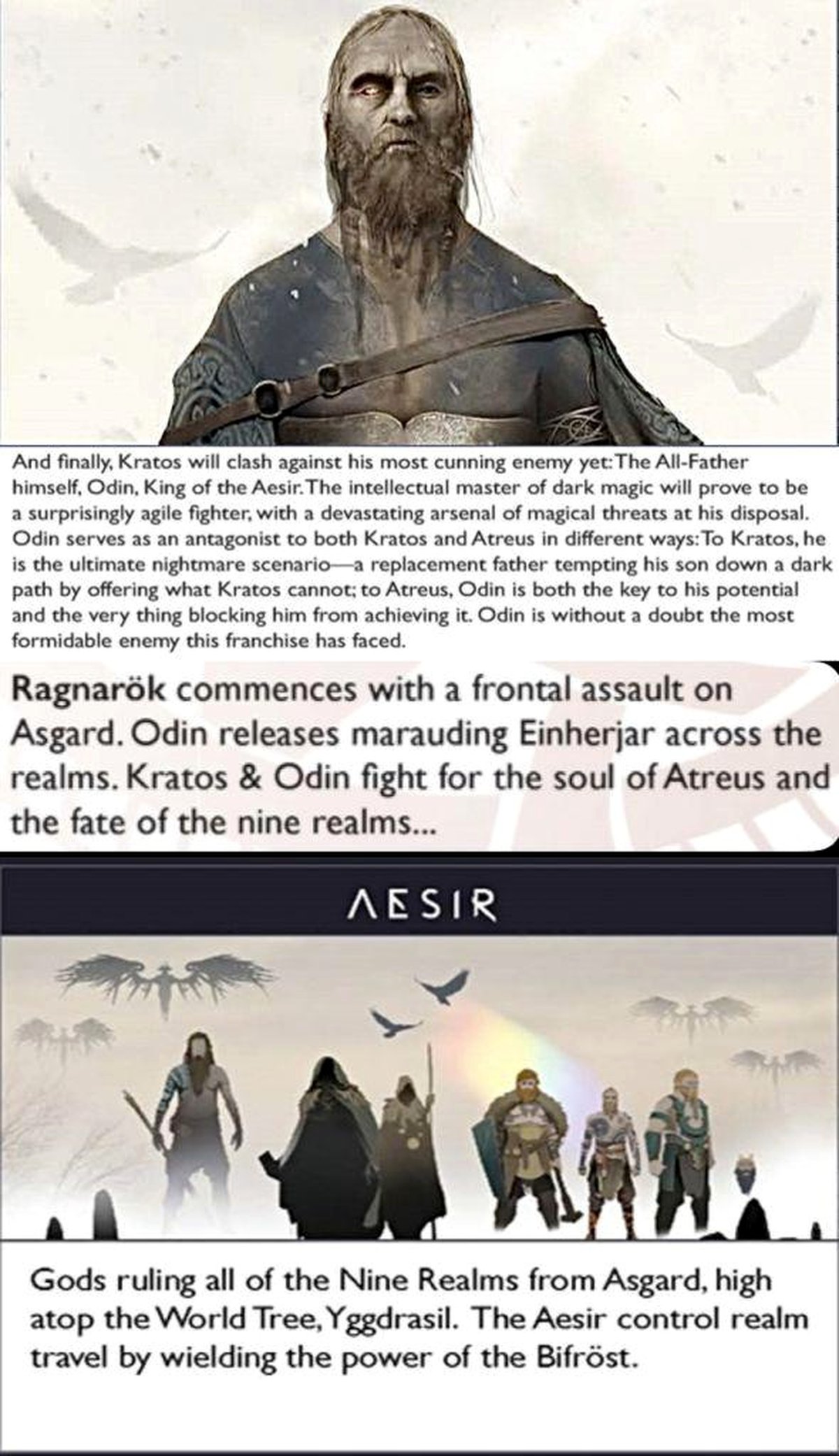 На другом концепте изображены асы, правители Асгарда; часть из них Кратос уже уничтожил. Асы, сообщает артбук, контролируют перемещения между девятью мирами с помощью радужного моста, а сам Асгард расположен на вершине Мирового Древа.