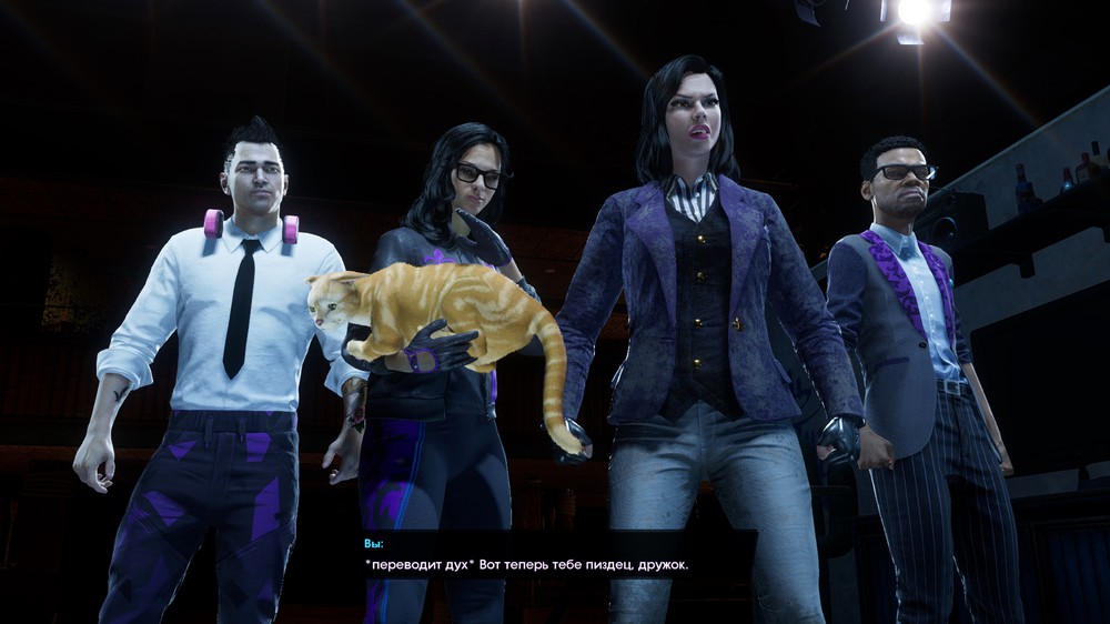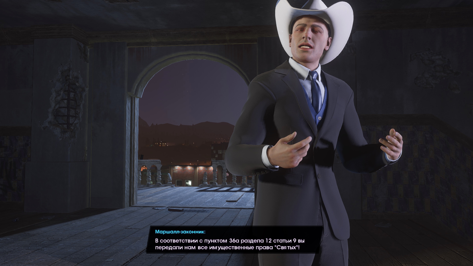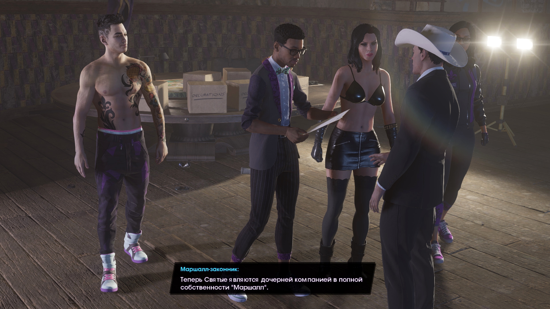 Где-то перед началом конца, к святым приходит правообладатель и говорит, что подписав договор с Маршалл, всё имущество святых принадлежат им... Я пока это писал, осознал всю тупость идеи... Авторские права на бандитов и убийц... Это реально тупость и как мне кажется, таким образом разработчики подчеркнули в лишний раз ту обстановку и те проблемы, что испытывает серия сейчас. Я уверен на все 100%, что изначально этой игры не должно было быть и они если бы и начали делать новую часть, то это была б пятая часть, а не это недоразумение.