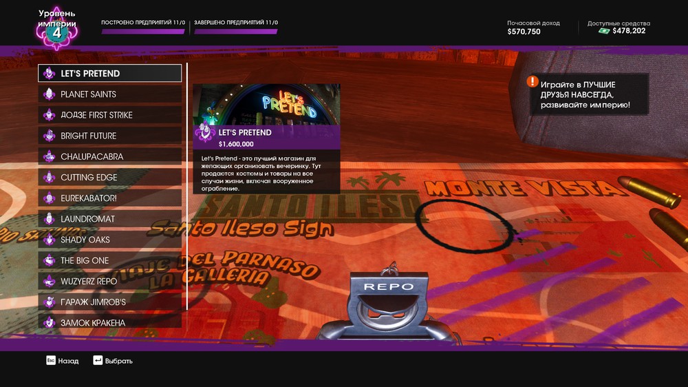 Однако, есть нюанс – некоторые магазины одежды вы откроете только после прохождения основного сюжета игры, а также если построите магазины "планета святых" и "давай притворимся"! Я прохожу всегда сначала все дополнительные задания, а потом уже добиваю основной сюжет, поэтому, после прохождения мне остаётся завершить всего пару тройку задач до 100%, либо ничего не остаётся и я игру попросту удаляю. Что касается магазинов "давай притворимся" и "планета святых" – оба влетят вам в копеечку, ибо нужно развивать империю, строя предприятия и проходя миссии, да и возможность постройки этих двух выпадает практически на финал игры...