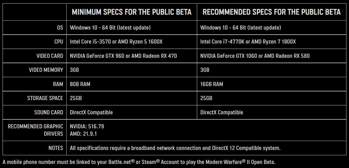 Activision и Infinity Ward опубликовали системные требования бета-версии Call of Duty Modern Warfare 2. Как минимум в бете игре не нужна очень мощная видеокарта: в минимальных требованиях значится GeForce GTX 960, в рекомендуемых — GeForce GTX 1060 или Radeon RX 580.