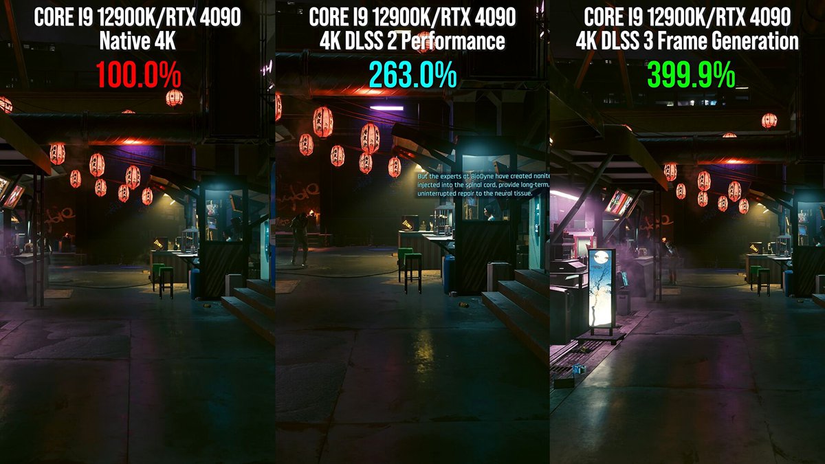 - Переход с GeForce RTX 3090 Ti на RTX 4090 и с DLSS 2 на DLSS 3 повысит частоту кадров в 2.5-3 раза.