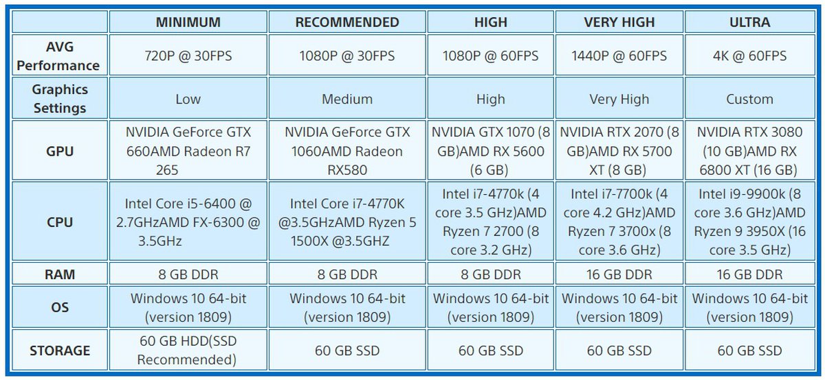 Системные требования выглядят достаточно приемлемо вплоть до разрешения 1440p. Здесь игре понадобится GeForce RTX 2070 и Intel Core i7-7700K, а также 16 гигабайт оперативной памяти.