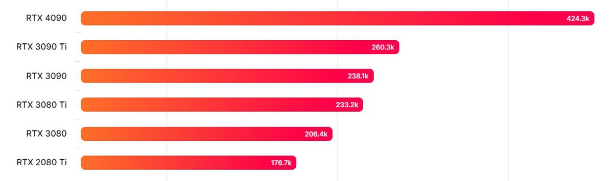 Работая в паре с процессором Ryzen 9 7950X, GeForce RTX 4090 набрала в бенчмарке Geekbench CUDA больше 424 тысяч баллов. Это значительно больше результатов видеокарты предыдущего поколения.