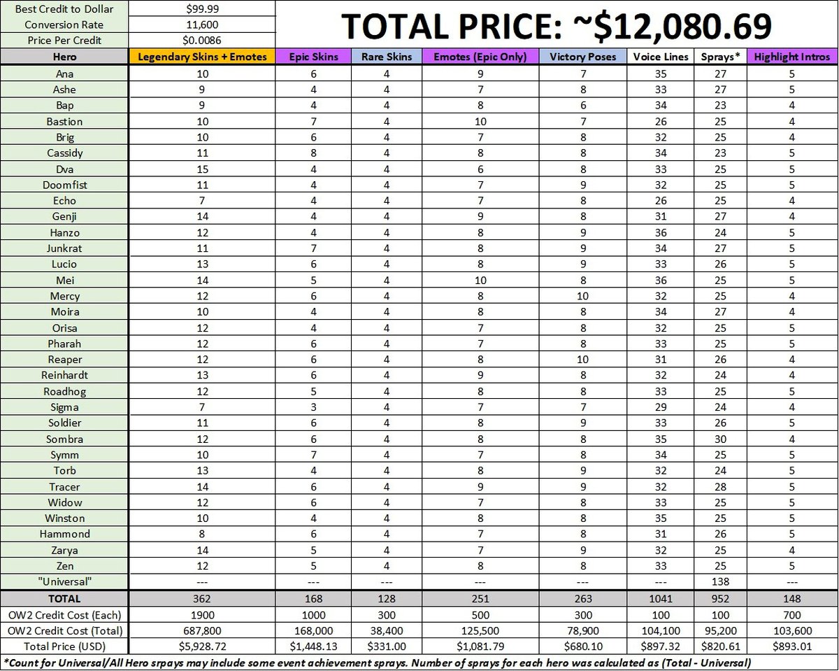 Согласно подсчетам реддитора loliscoolyay4me, на момент релиза весь внутриигровой контент Overwatch 2 стоит $12080.69. Дороже всего обойдутся легендарные облики и эмоции: набор для всех героев стоит $5928.72.