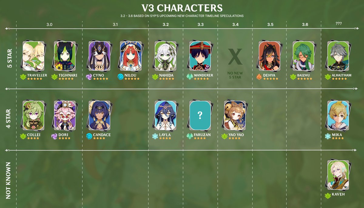 Ориентируясь на данные инсайдеров, участники сабреддита Genshin Impact Leaks собрали инфографику, где показаны обновления и персонажи, которые появятся вместе с ними. Обратите внимание: начиная с обновления 3.4 полностью достоверных данных нет.