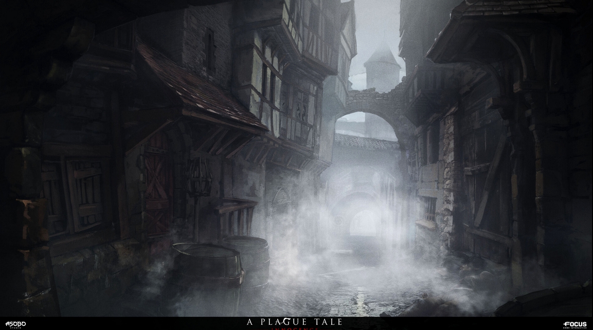 A Plague Tale: Innocence — игра достаточно тёмная. Разработчикам пришлось всячески изощряться, чтобы пушистые шкурки не сливались с грязными улицами, тёмными подвалами и заброшенными домами. На помощь пришли сизый туман, пятьдесят оттенков грязно-коричневого и святящиеся глаза.
