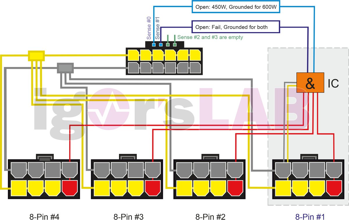 Чтобы узнать, как все устроено, Валлосек изучил оригинальный переходник Nvidia, идущий в комплекте с видеокартой. Оказалось, что переходник умнее, чем кажется: он может определять, сколько кабелей к нему подключено.