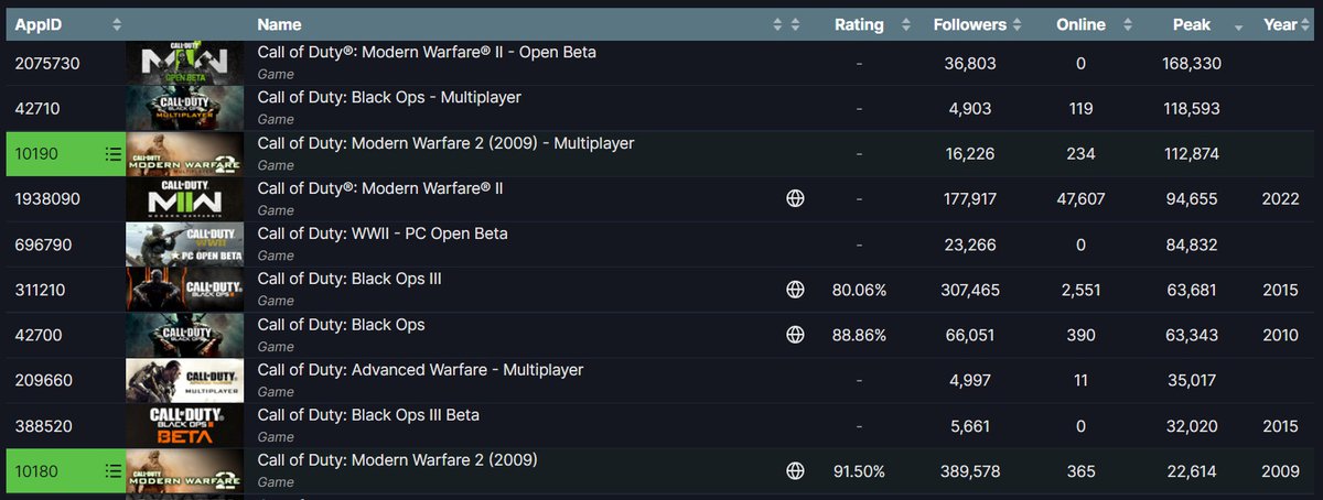 Ближайшим конкурентом Call of Duty Modern Warfare 2 стала Call of Duty Black Ops 3, на старте привлекшая 63681 игрока одновременно. Затем идет первая Black Ops с пиковым онлайном в 63343 игрока.