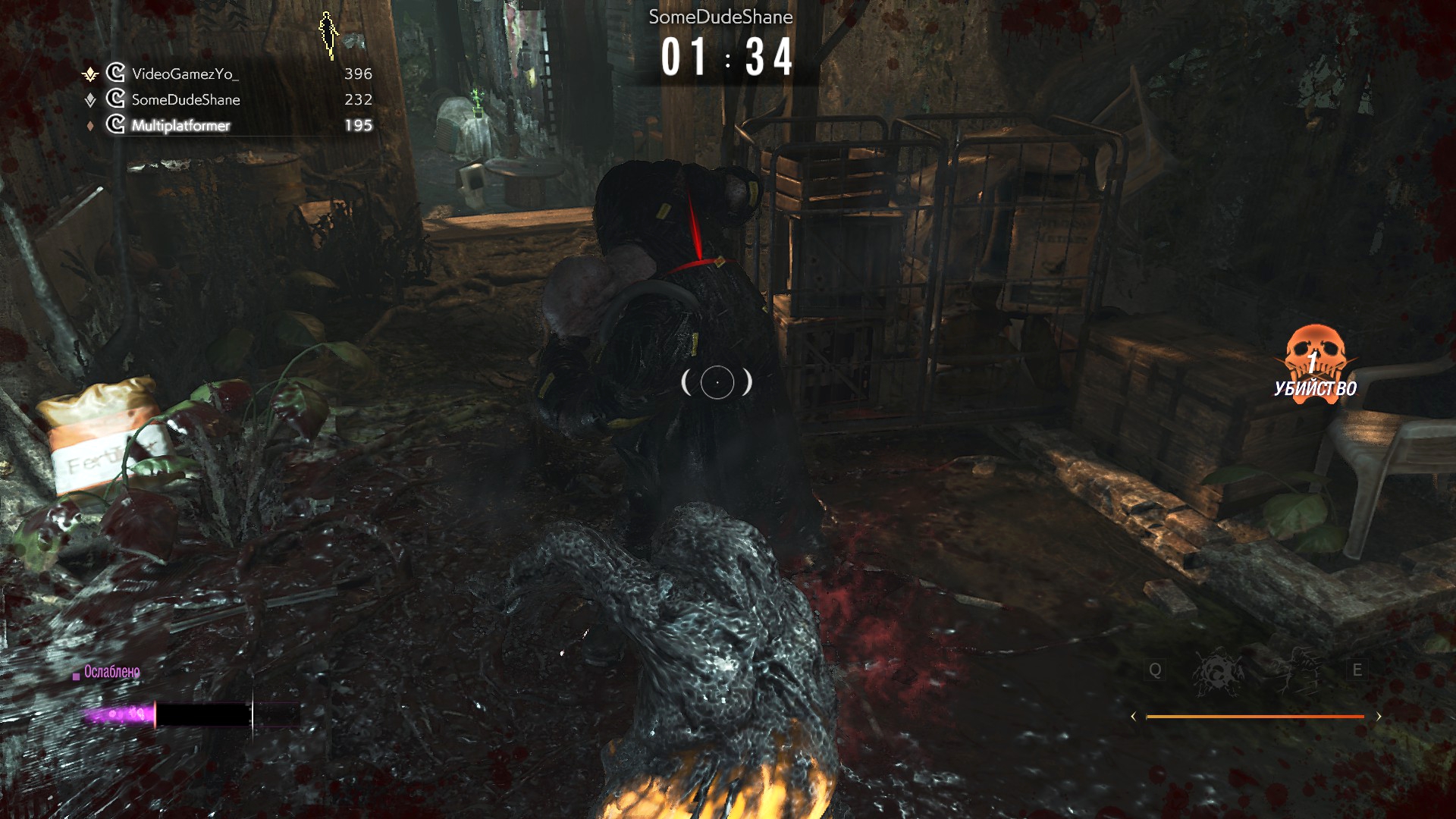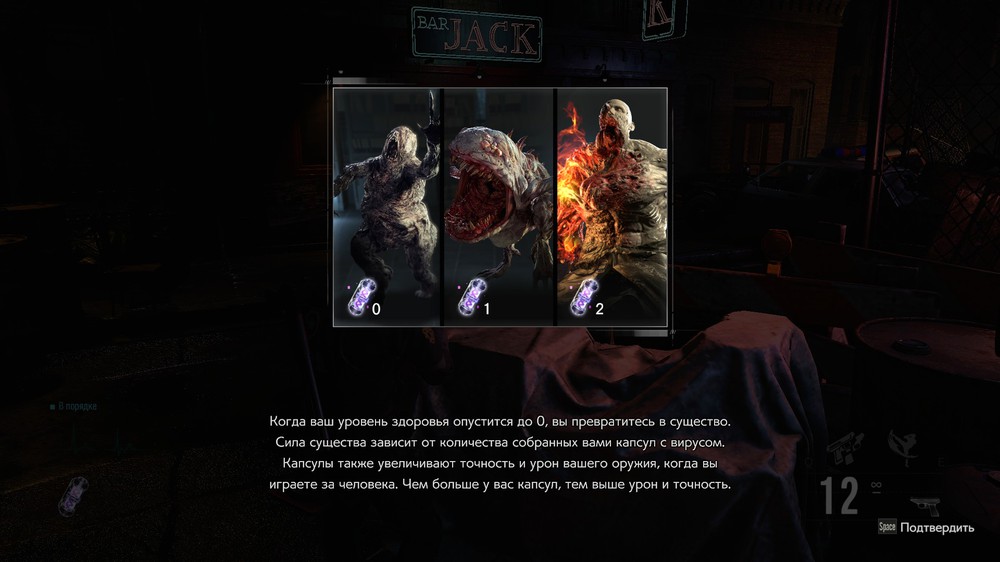 Проще говоря, матчи проходят следующим образом: вы сначала играете за героя, а если вас убивают – вы мутируете в одного из перечисленных существ. Существ выбирать просто так, как героев – нельзя! Чтобы мутировать в конкретного монстра – нужно собрать определённое количество колб с вирусом. Проще говоря, если вы не подобрали колбу, то будете обычным плесневиком, подобрали одну колбу – гамма хантер, а если вы подобрали 2 и выше колбы – случайный выбор между Джеком Бейкером, Тираном или Немезисом.