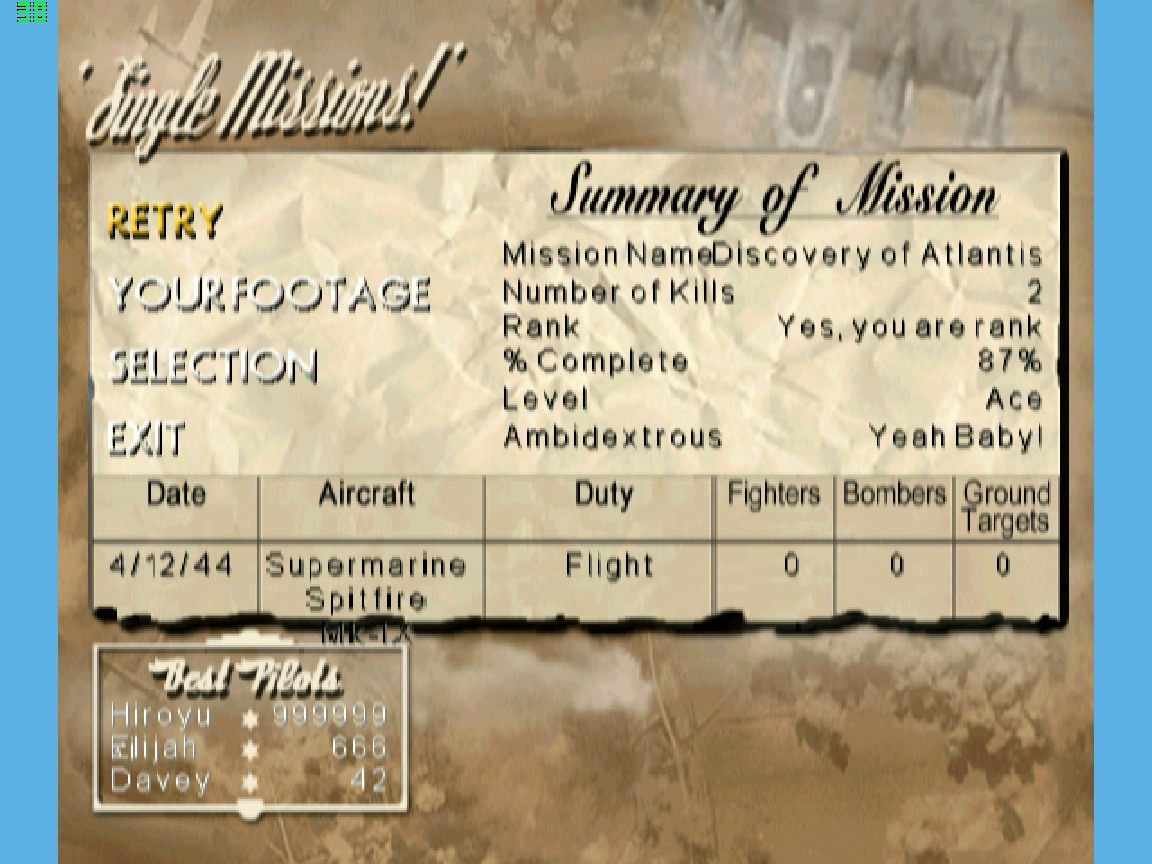 Прототип от 27 сентября 2000 года и игра всё также стартует с просмоторщика моделей... Но, пропустив просмоторщик нам дают поиграть! Однако, вся карта выглядит как игры с первой PlayStation, врагов нет, а земля и дома не имеют коллизий. Тоже больше смахивает на техническую демо-версию. При нажатии на кнопку "Y" – миссия завершается, и задача считается выполненной... Вот он – Press "Y" to win в чистом виде! Впрочем, в меню можно кастомизировать самолёт и создать собственного пилота, только это всё находится на стадии зародыша.