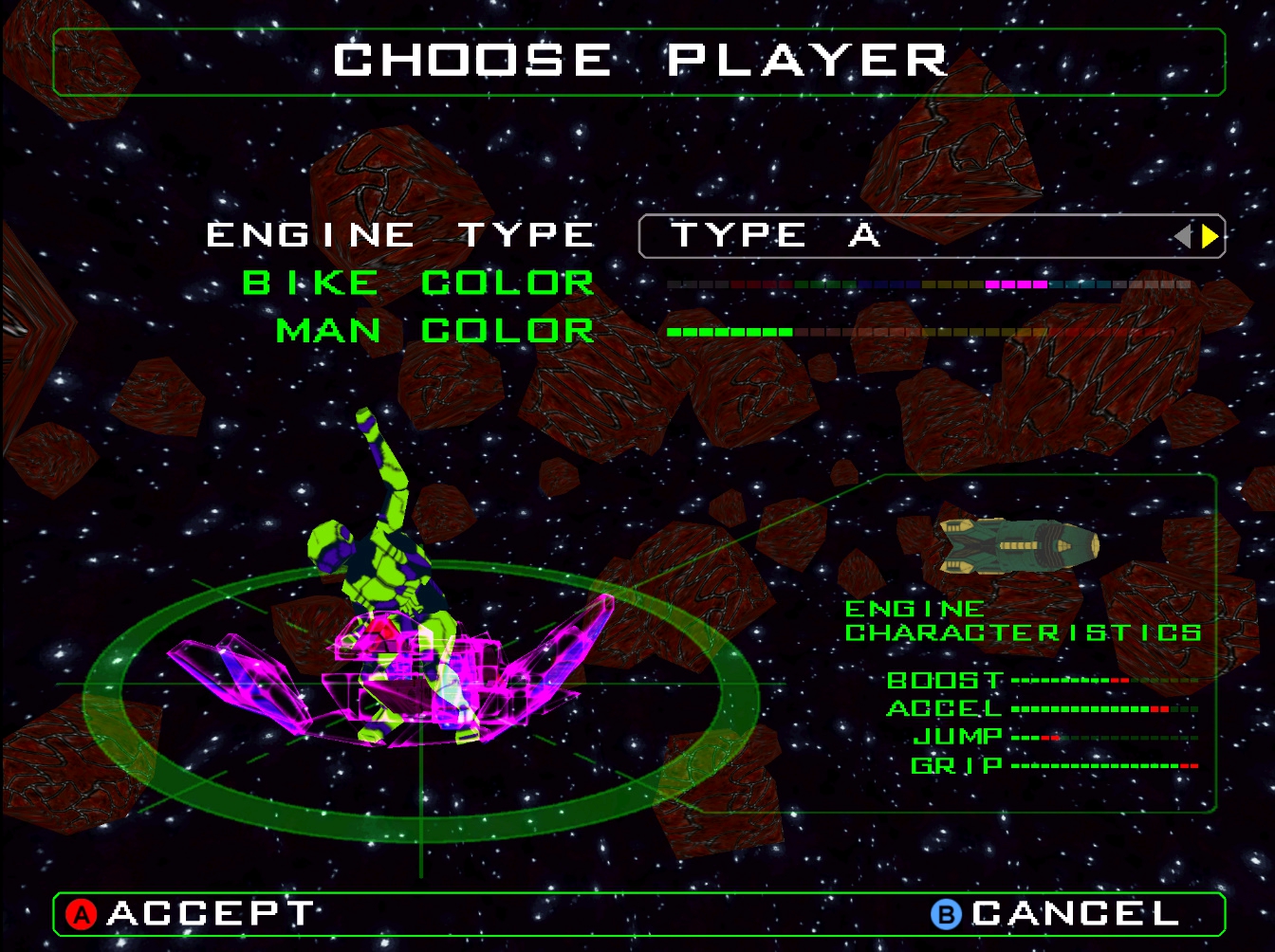 В игре можно сменить цвет водителя и мотоцикла. Во время заездов можно прыгать, собирать улучшения и ускорители с ловушками для соперников. На каждую трассу даётся по три круга, не больше и не меньше.