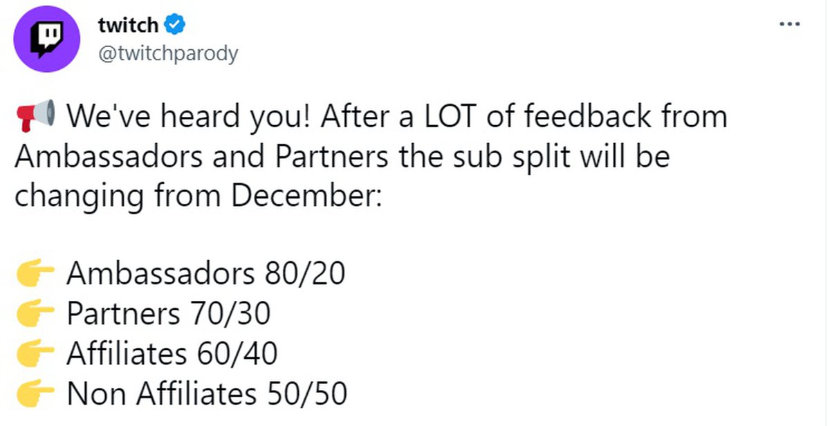 Пародийный аккаунт Twitch, объявивший о перераспределении доходов, жив до сих пор — как и само сообщение с новым распределением выручки.