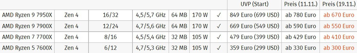 Сильнее всего подешевел топовый Ryzen 9 7950X (-110 евро), меньше всего цена снизилась на Ryzen 7 7700X (-19 евро).